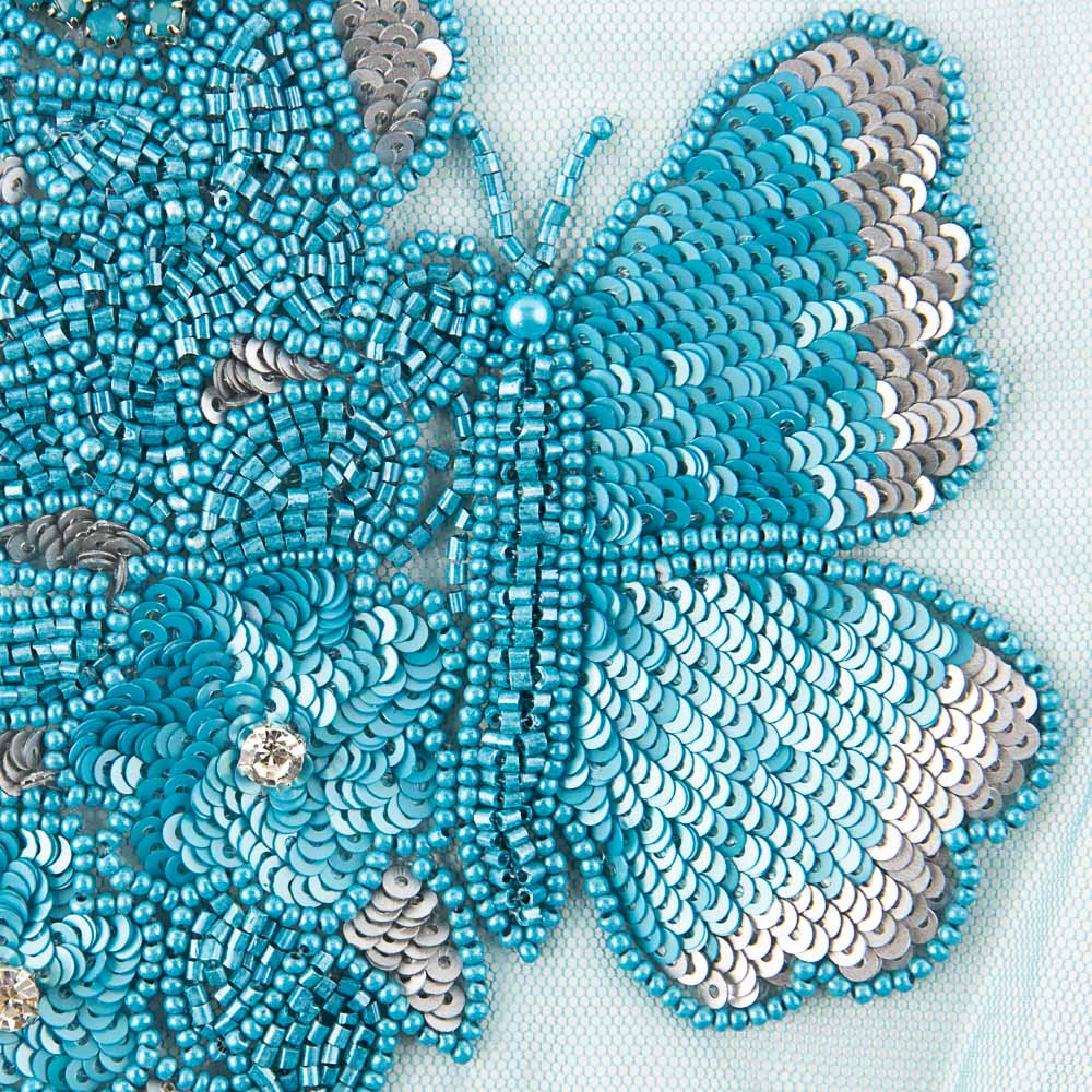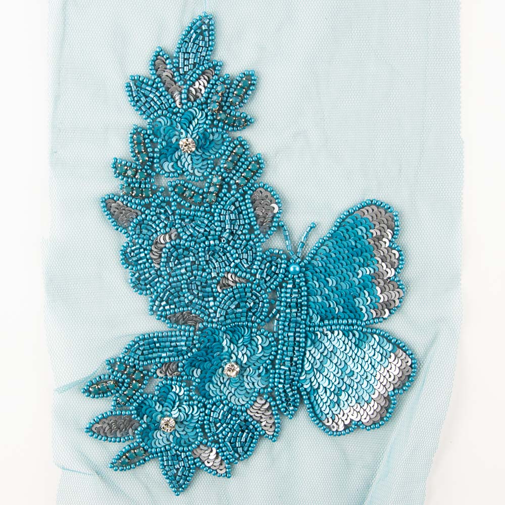 Aplique de pedraria em forma de flores e borboletas em tons de azul. Apliques de pedraria para vestidos de festa em cintos, broches... Trazem elegância e um toque de classe às suas criações. Medidas aproximadas: Largura 12 cm e comprimento 17 cm.