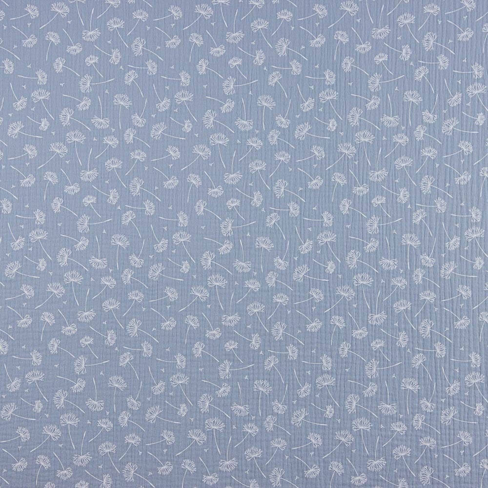Bambula de algodão orgânico com estampa de dente de leão azul médio. A bambula ou gaze dupla de algodão é um tecido fresco e fluido, caracterizado pelas dobras que formam a estrutura e o corpo do tecido. É um tecido fino e opaco, por isso não necessita de nenhum tipo de forro. Se você está procurando um tecido de qualidade para vestidos, saias, calças ou camisas de verão, o bambula de algodão certamente atenderá a esses requisitos.
