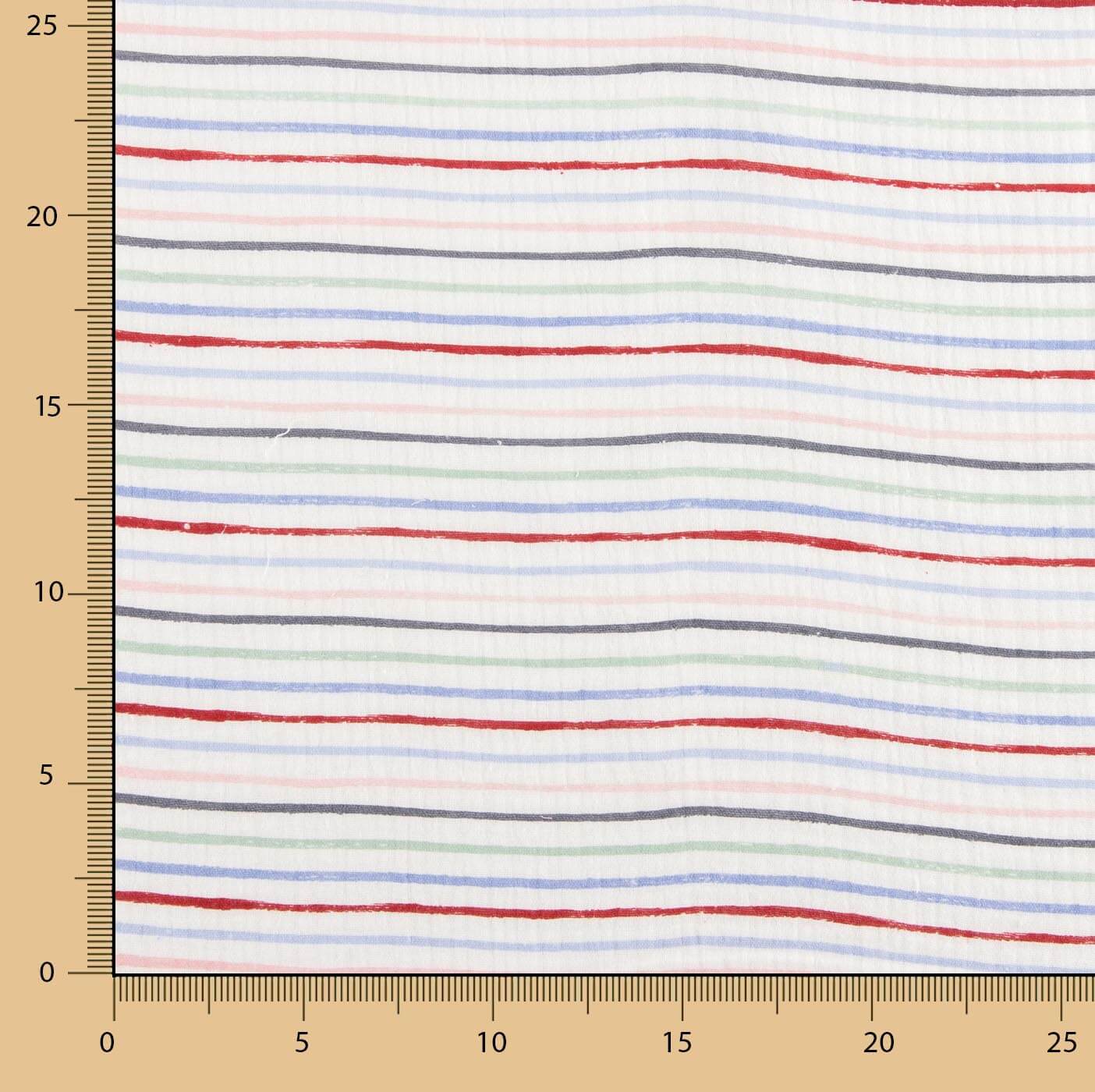 Tecido Bambula ou Gaze Dupla 100% Algodão estampado com riscas multicoloridas com uma largura de 150 cm. Desenhado com riscas finas de aproximadamente 2 mm, este tecido destaca-se pela sua textura ligeiramente enrugada e pelas suas pregas naturais características que conferem estrutura e volume ao tecido.