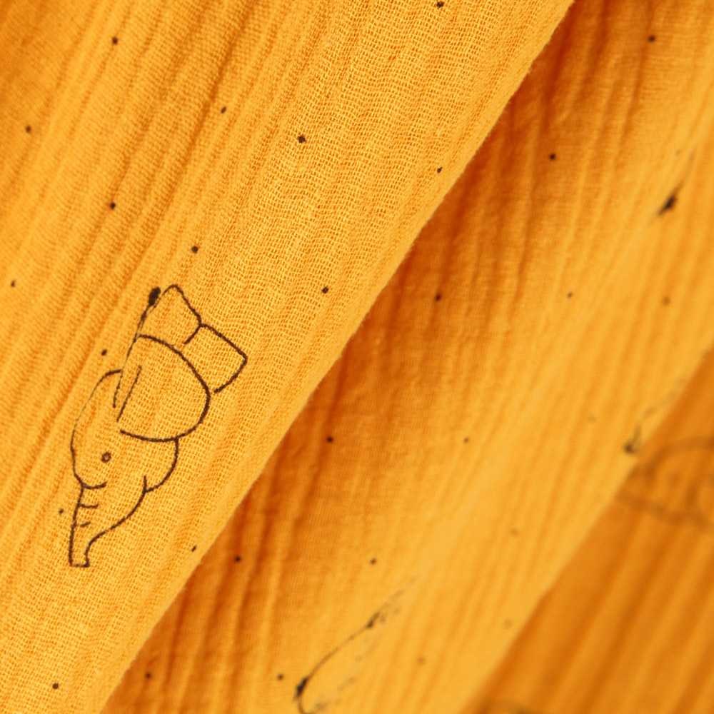 Tecido de algodão ocre, com estampa de elefantes. A bambula é um tecido de algodão muito leve, fino e com sustentação. É caracterizada por pequenas pregas permanentes que dão corpo e textura ao tecido. É leve e confortável, uma ótima opção de tecido para fazer vestidos, saias, calças e blusas.