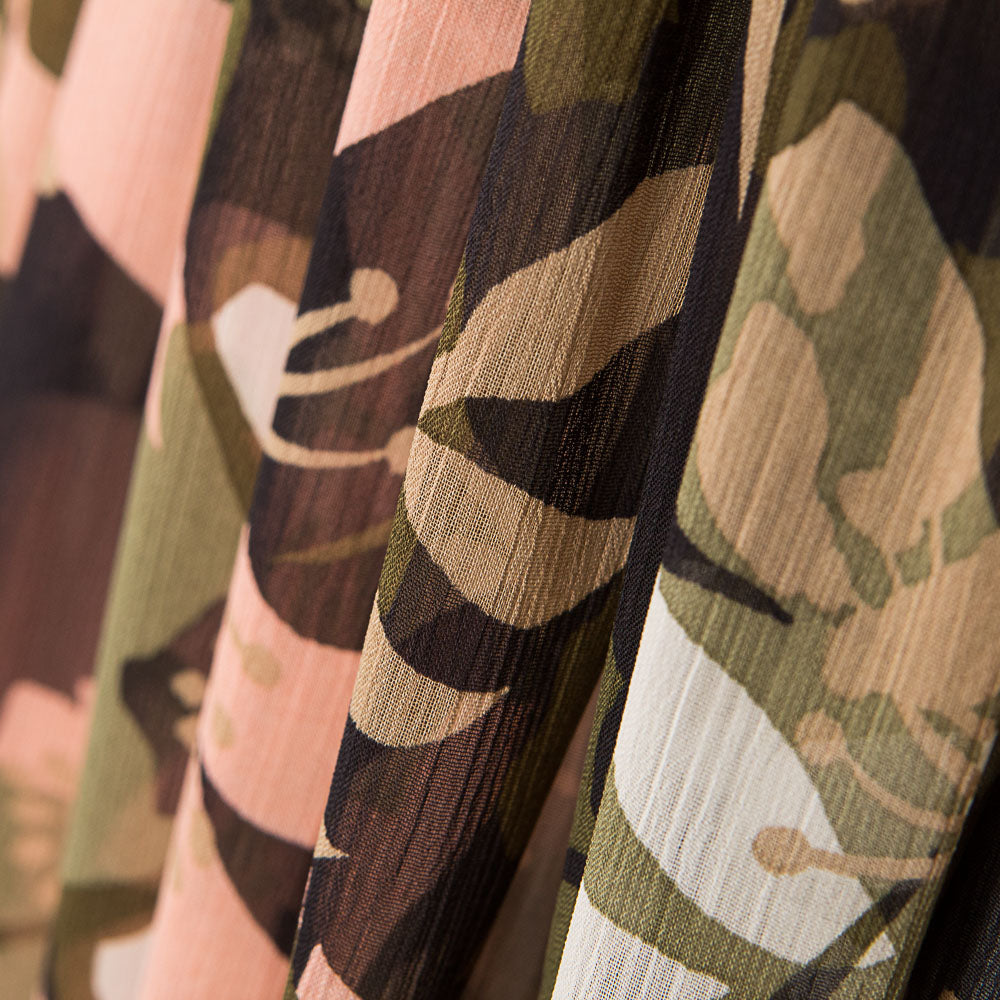 Bambula com grandes flores em verde militar e salmão. Tecido muito fluido e fino, com queda e ligeiramente translúcido. É um tecido estampado ideal para fazer quimonos, vestidos e vestidos de festa, blusas, calças de perna larga, e muito mais peças de vestuário da moda. É aconselhável acrescentar um forro, pois pode ser transparente.