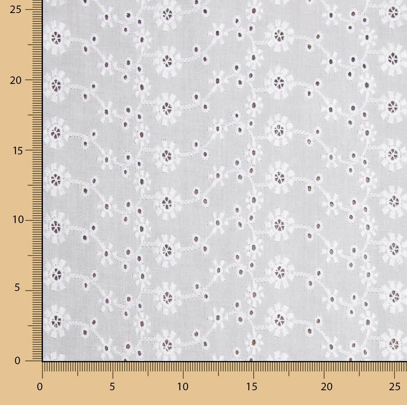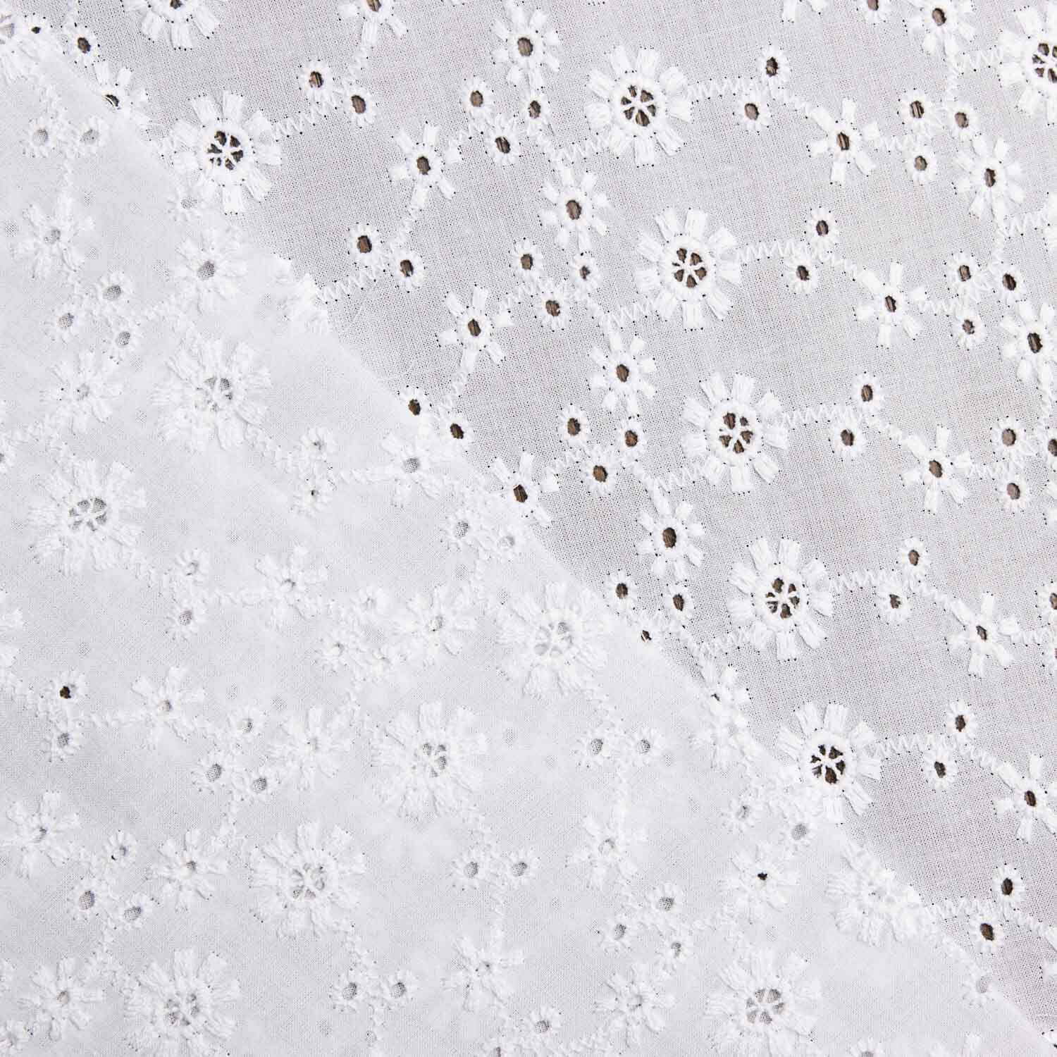 Tecido com bordado suíço perfurado flor campo branco natural. Tecido 100% algodão tipo voile de cor branca, suave, ligeiramente sustentado. Bordado calado flamenco de algodão fino, com toque natural e relevo criado pelo próprio bordado. Tecido bordado de grande qualidade, que intercala um gracioso perfurado muito subtil, proporcionando um jogo de transparências fresco e juvenil. Tecido ideal para a confeção de trajes de sevillana, aplicações e folhos de flamenca. Pode utilizar este tipo de bordado suíço de voile nas suas criações mais frescas, conferindo-lhes um ar romântico e descontraído: vestidos ibicencos, blusas, tops, saias... bem como em acessórios e adornos.