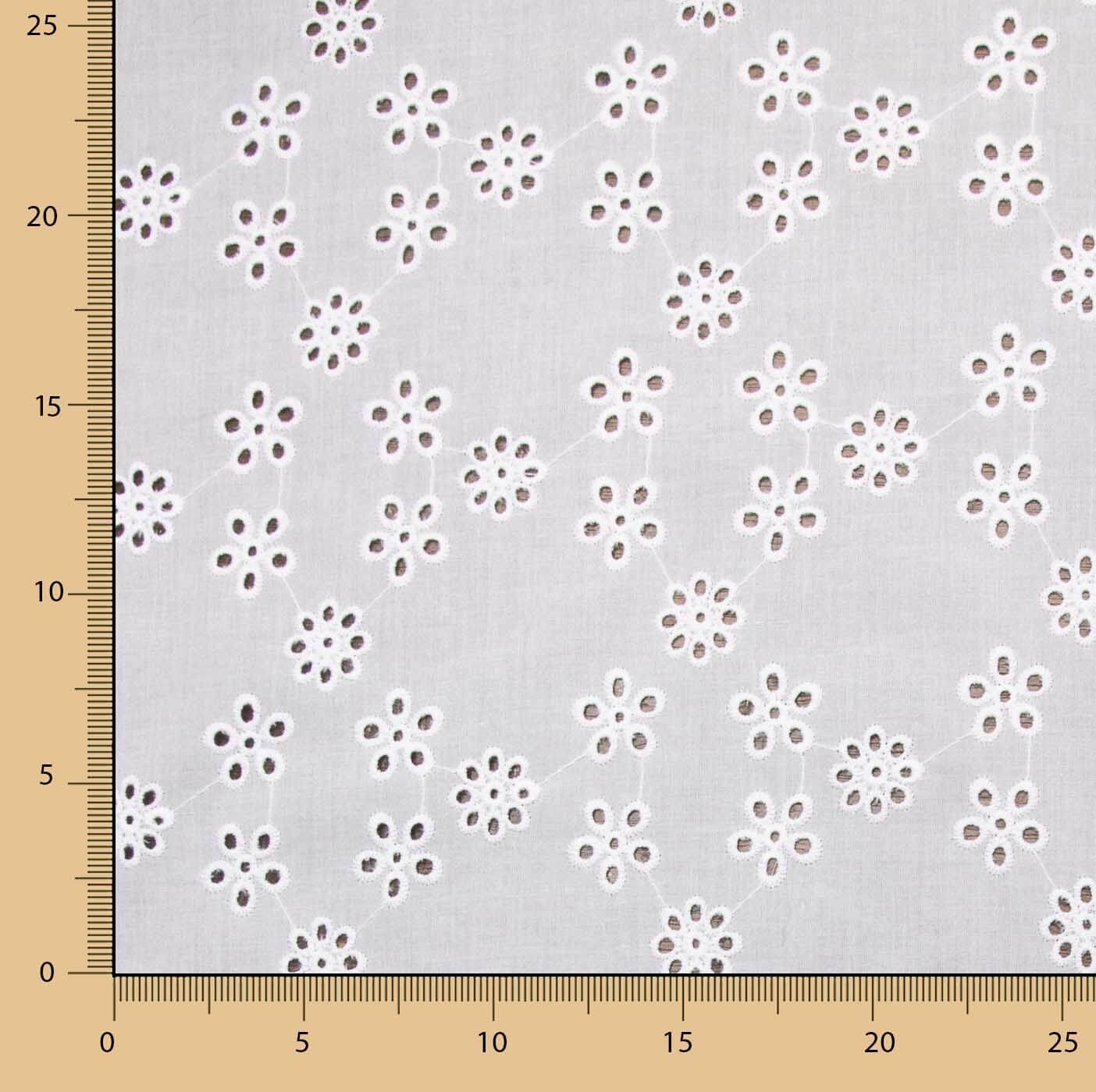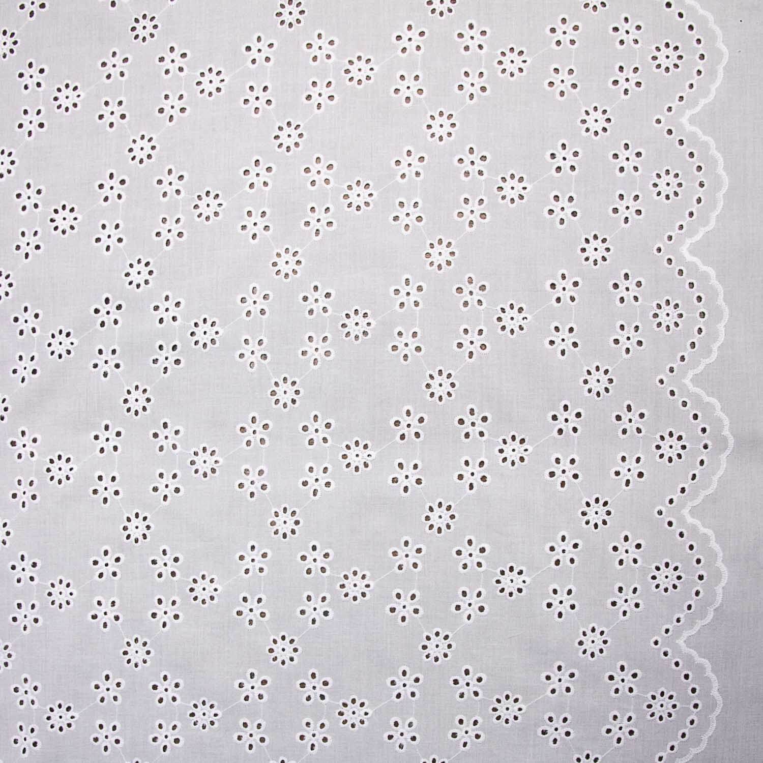 Tecido com bordado suíço perfurado com ramo de flores branco natural. Tecido 100% algodão tipo voile de cor branca, suave e ligeiramente sustentado. Bordado calado flamenco de algodão fino, com toque natural e relevo criado pelo próprio bordado. Tecido bordado de grande qualidade, que intercala um gracioso perfurado muito subtil, proporcionando um jogo de transparências fresco e juvenil. Tecido ideal para a confeção de trajes de sevillana, aplicações e folhos de flamenca. Pode utilizar este tipo de bordado suíço de voile nas suas criações mais frescas, conferindo-lhes um ar romântico e descontraído: vestidos ibicencos, blusas, tops, saias... bem como em acessórios e adornos.