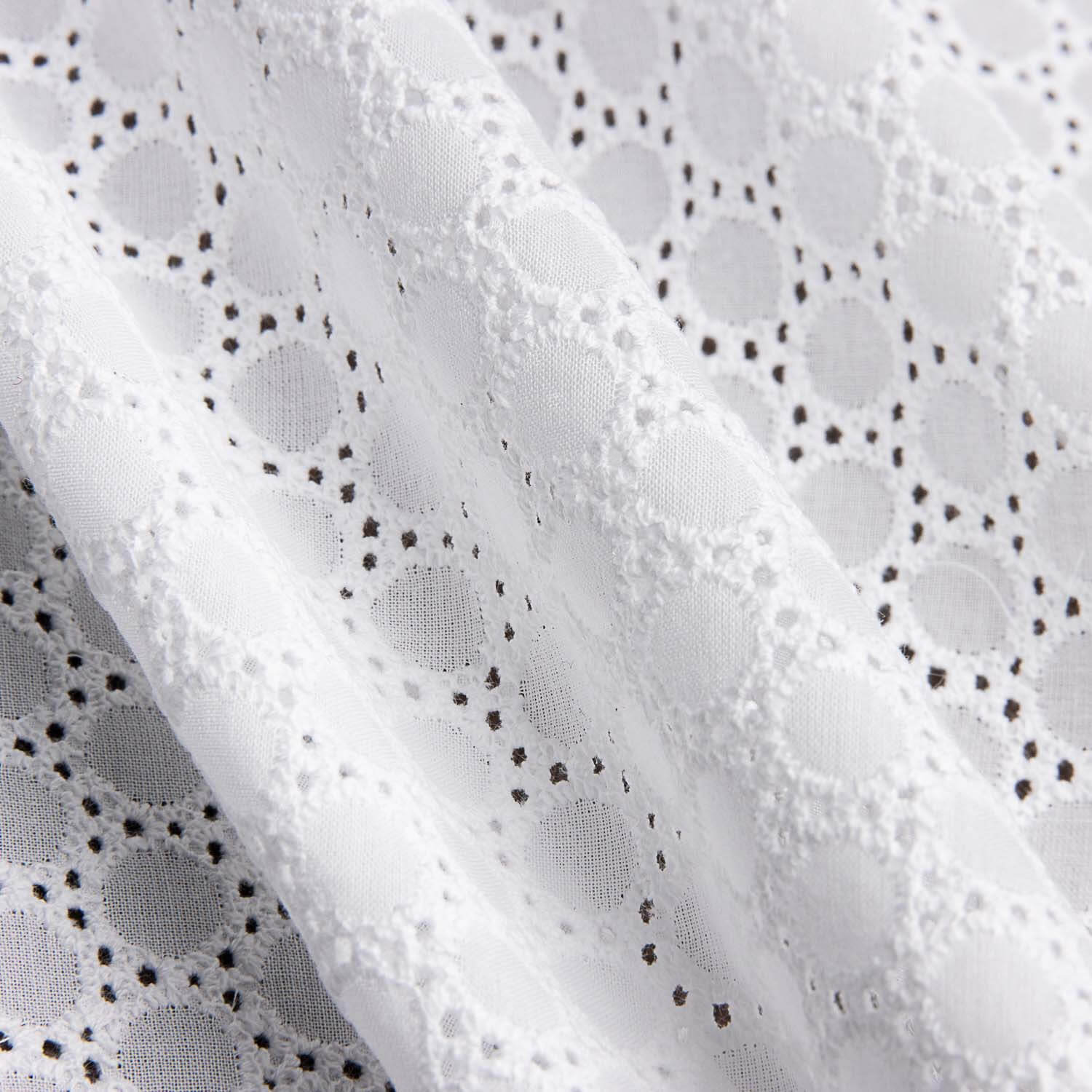 Tecido com bordado suíço perfurado geométrico branco natural. Tecido 100% algodão tipo voile de cor branca, suave, ligeiramente sustentado. Bordado calado flamenco em algodão fino, com toque natural e relevo criado pelo próprio bordado. Tecido bordado de grande qualidade, que intercala um gracioso perfurado muito subtil, proporcionando um jogo de transparências fresco e juvenil. Tecido ideal para a confeção de trajes de sevillana, aplicações e folhos de flamenca. Pode utilizar este tipo de bordado suíço de voile nas suas criações mais frescas, conferindo-lhes um ar romântico e descontraído: vestidos ibicencos, blusas, tops, saias... bem como em acessórios e adornos.