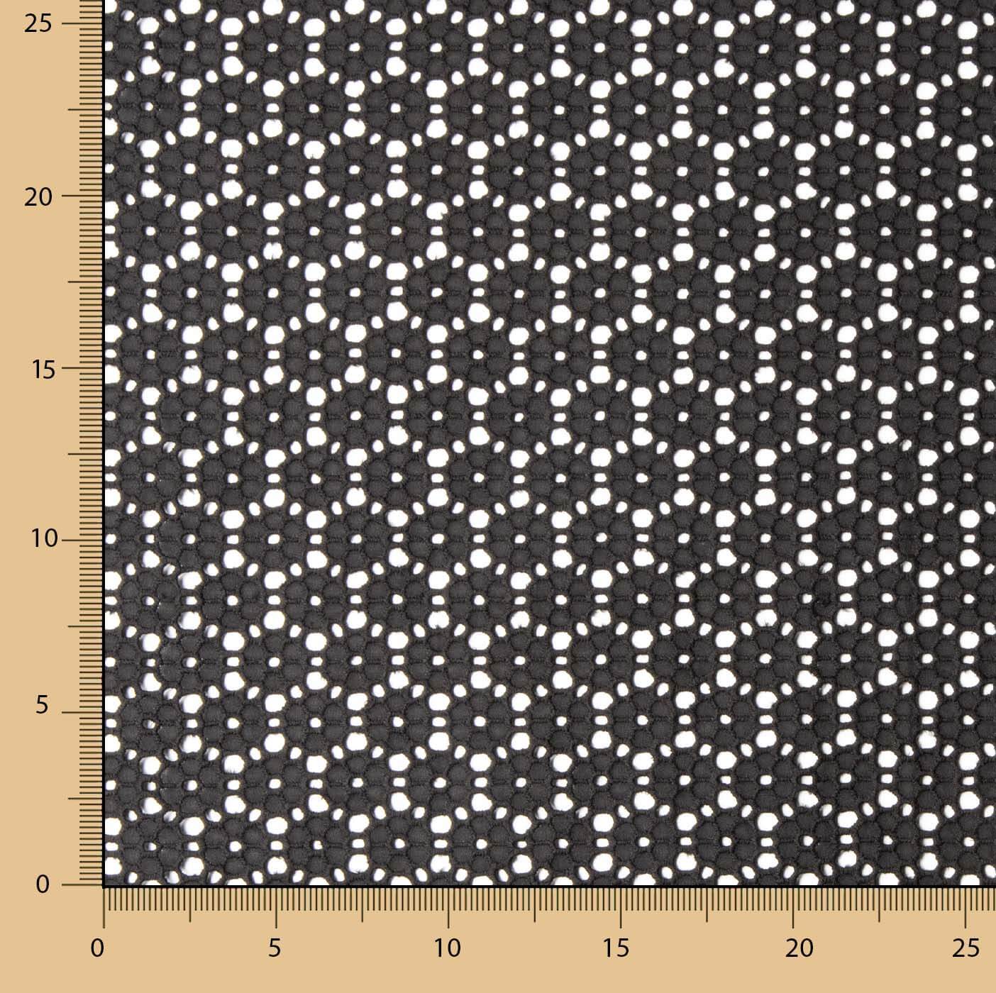 Tecido com bordado suíço perfurado margarida preto. Tecido 100% algodão tipo voile branco, suave, ligeiramente sustentado. Bordado calado flamenco de algodão fino, com toque natural e relevo criado pelo próprio bordado. Tecido bordado de alta qualidade, que intercala um gracioso perfurado muito sutil, proporcionando um jogo de transparências fresco e juvenil. Tecido ideal para a confeção de trajes de sevillana, aplicações e folhos de flamenca. Pode utilizar este tipo de bordado suíço de voile nas suas criações mais frescas, conferindo-lhes um ar romântico e descontraído: vestidos ibicencos, blusas, tops, saias... bem como em acessórios e adornos.