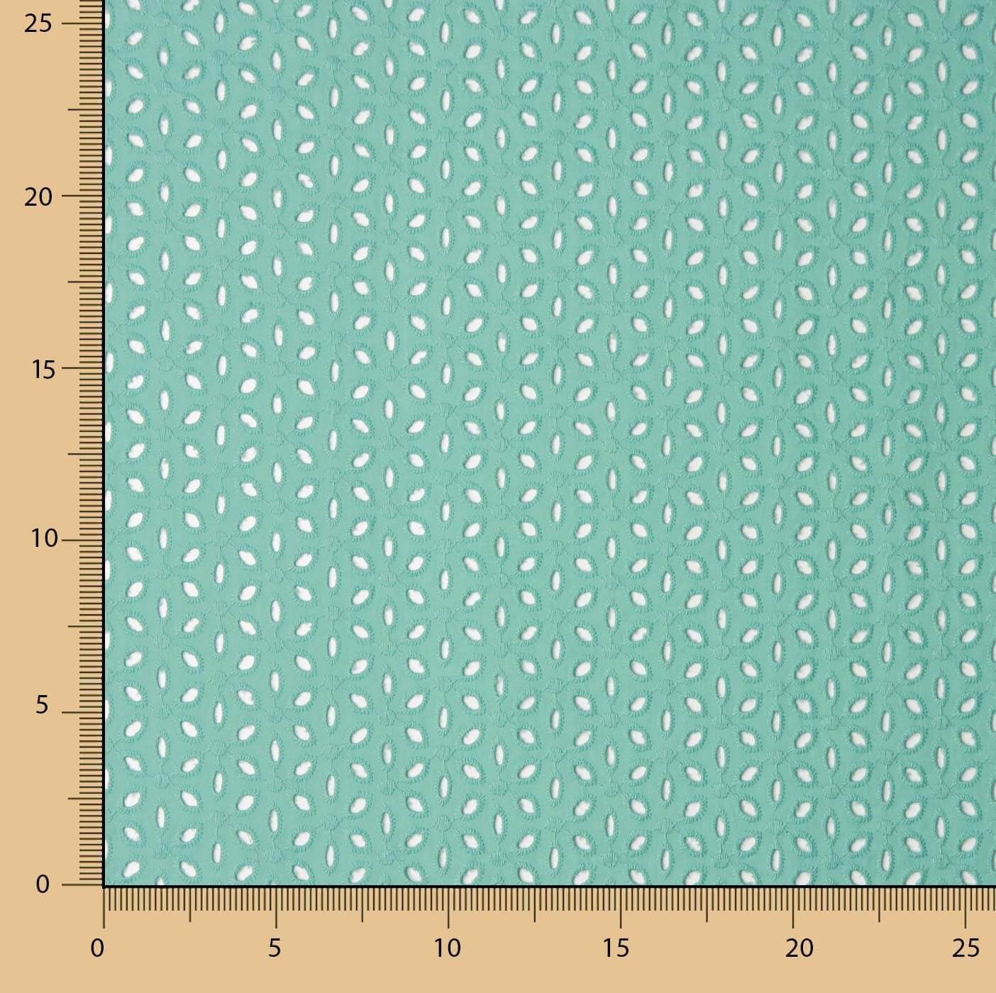 Tecido com bordado suíço perfurado em pétalas verde-água. Tecido 100% algodão tipo voile branco, suave e ligeiramente resistente. Bordado calado flamenco em algodão fino, com toque natural e relevo criado pelo próprio bordado. Tecido bordado de alta qualidade, que intercala um gracioso perfurado muito sutil, proporcionando um jogo de transparências fresco e juvenil. Tecido ideal para a confeção de trajes de sevillana, aplicações e folhos de flamenca. Pode utilizar este tipo de bordado suíço de voile nas suas criações mais frescas, conferindo-lhes um ar romântico e descontraído: vestidos ibicencos, blusas, tops, saias... bem como em acessórios e adornos.