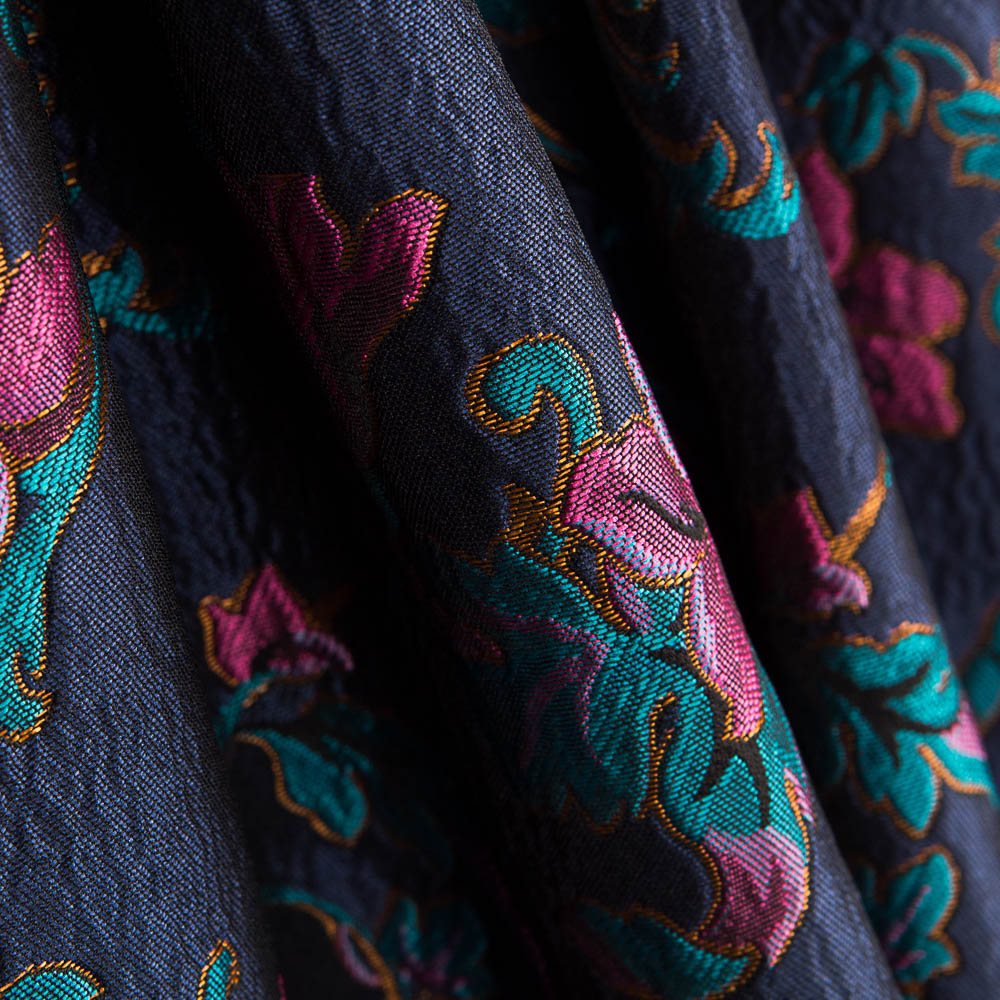 Tecido de brocado floral fúcsia. Tecido fino e opaco, com pouco corpo e uma certa rigidez. Ideal para a confecção de acessórios, fatos, vestidos e decoração.