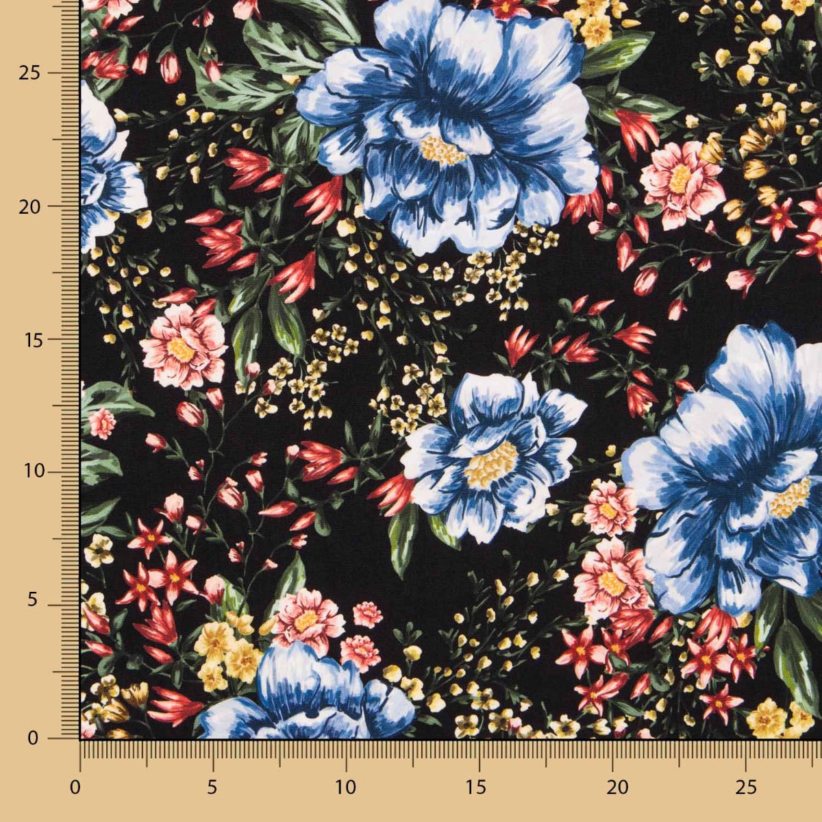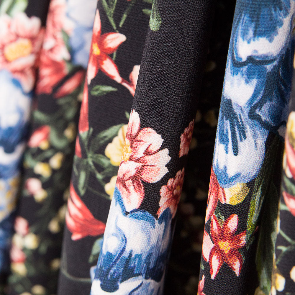 Tecido geométrico sobre base de poliéster acetinado fosco. Tecido cetim fosco com drapeado, muito fluido e fino, com uma textura sedosa e macia. Tecido de flores para fazer vestidos, saias, calças, blusas e todo o tipo de vestuário da moda.