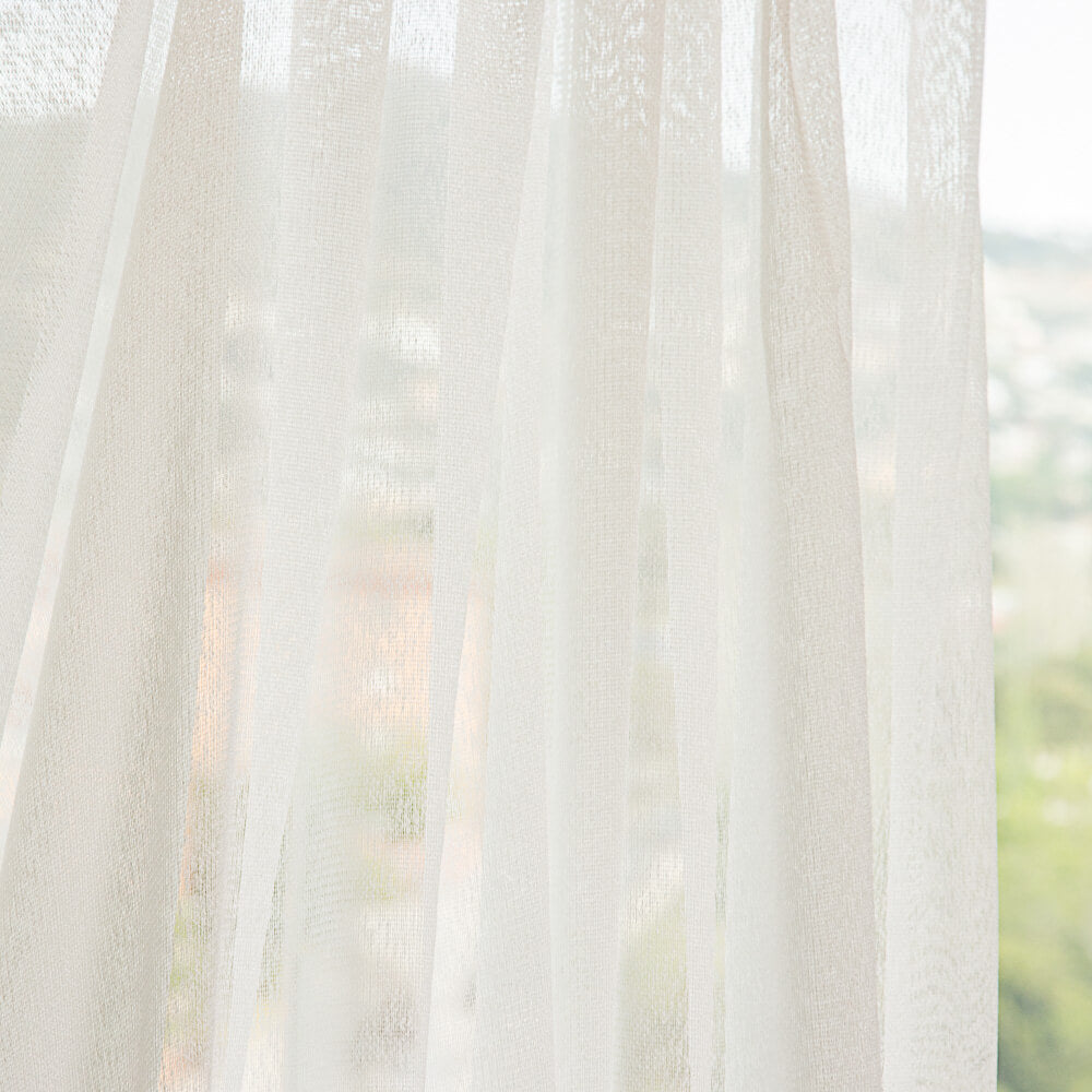 Cortina transparente com aspecto de rede brilhante em branco natural. Cortina em tecido Etamin com acabamento em fita de chumbo cru. Tecido 100% poliéster com largura prática de 280cm. É um tecido para cortinas translúcido e com bom caimento para fazer cortinas. Pela sua composição é um tecido muito fácil de cuidar. Não encolhe e pode ser lavado na máquina a 30º com uma centrifugação suave. Se pendurar as cortinas úmidas, com o próprio peso elas ficarão perfeitas sem a necessidade de passar a ferro. Recomenda-se não usar amaciante. Não permite secador. Tecido fino e básico transparente, com trama aberta e baixa opacidade, permite a entrada de luz sem ver o interior da casa à primeira vista, desde que o tecido seja franzido ou com ripas.