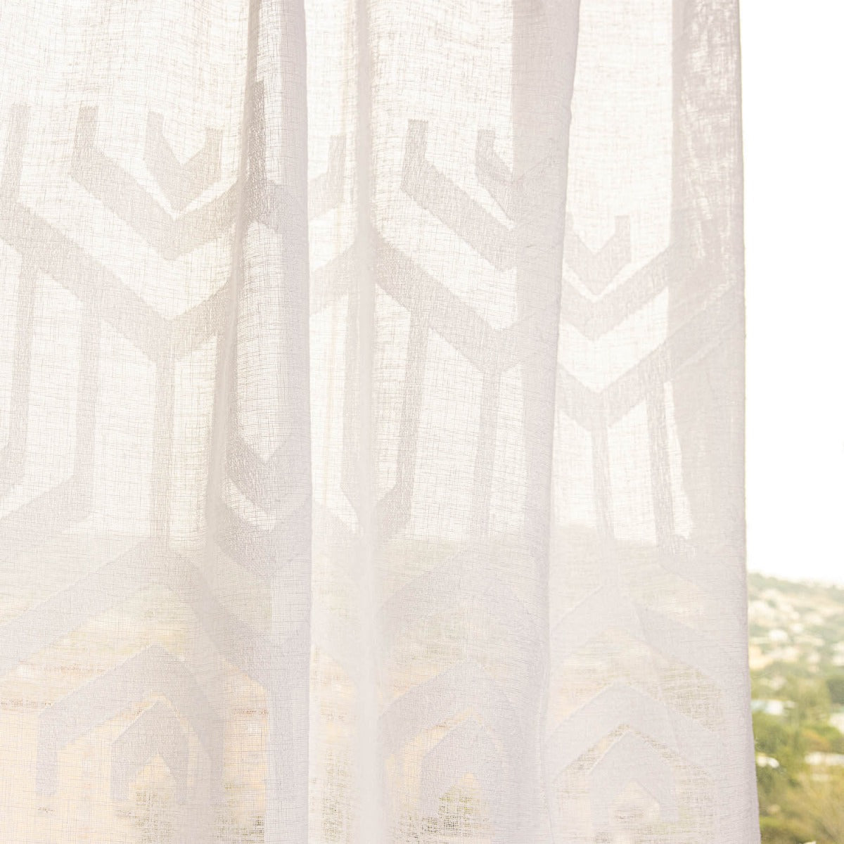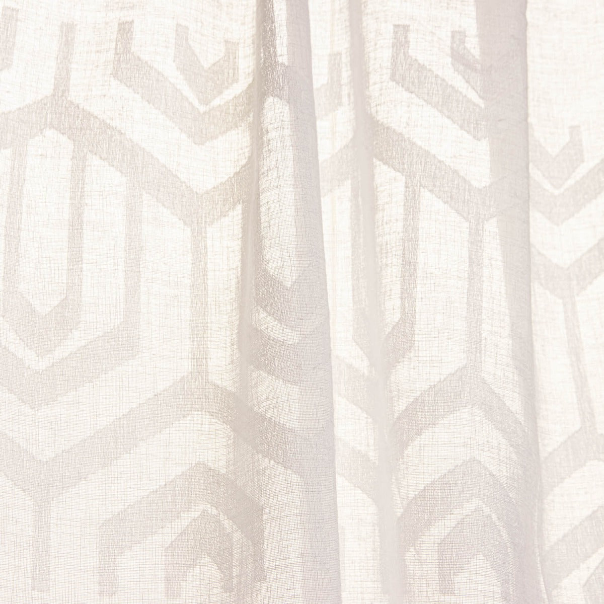 Tecido para cortinas geo branco. Tecido 100% poliéster com um caimento e um toque requintados, com uma altura de 280 cm. É um tecido translúcido com um bom caimento para cortinados. Devido à sua composição, é um tecido muito fácil de cuidar. Não encolhe e pode ser lavado na máquina a 30° com uma centrifugação suave. Se pendurar os cortinados húmidos, com o seu próprio peso, ficarão perfeitos sem necessidade de passar a ferro. Recomenda-se a não utilização de amaciador de roupa. Não secar na máquina de secar roupa. O tecido já vem terminado numa das ourelas da largura com um cordão de chumbo, que serve de peso, pronto a ser utilizado como extremidade do fundo das suas cortinas.