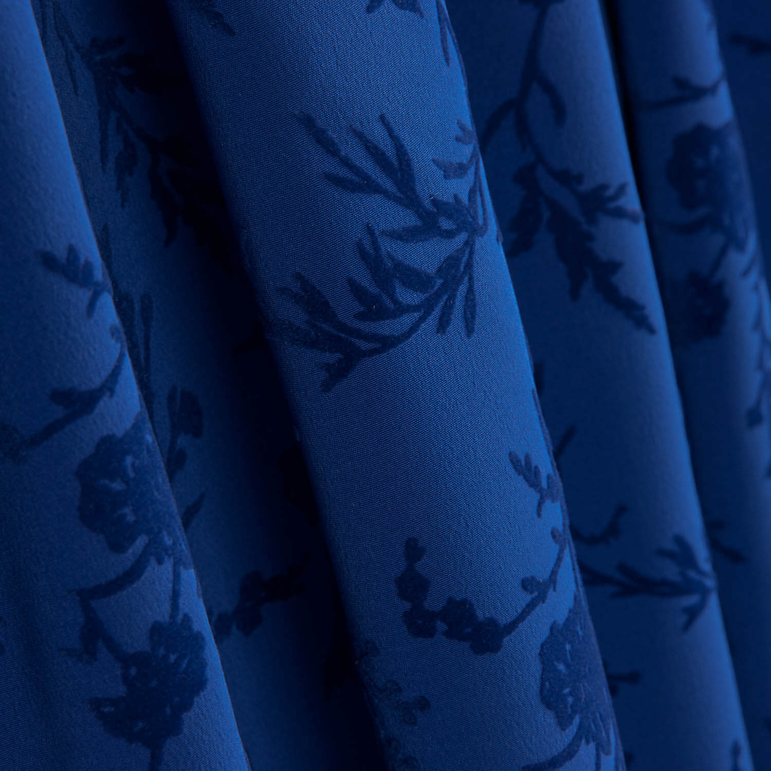Tecido exclusivo de crepe koshibo 100% poliéster em elegante tom azulina com flocado em relevo de flores e ramos em azul intenso, concebido para o catálogo de flamenco da Ribes & Casals. O seu acabamento ligeiramente granulado e excelente caimento conferem fluidez, volume e movimento a qualquer design flamenco. O koshibo é um tecido leve, resistente e com um caimento magnífico, muito apreciado na confeção de trajes de flamenca pelo seu conforto e facilidade de confeção. O flocado floral em azul intenso cria um contraste profundo e sofisticado, conferindo textura e elegância a designs com caráter e personalidade.