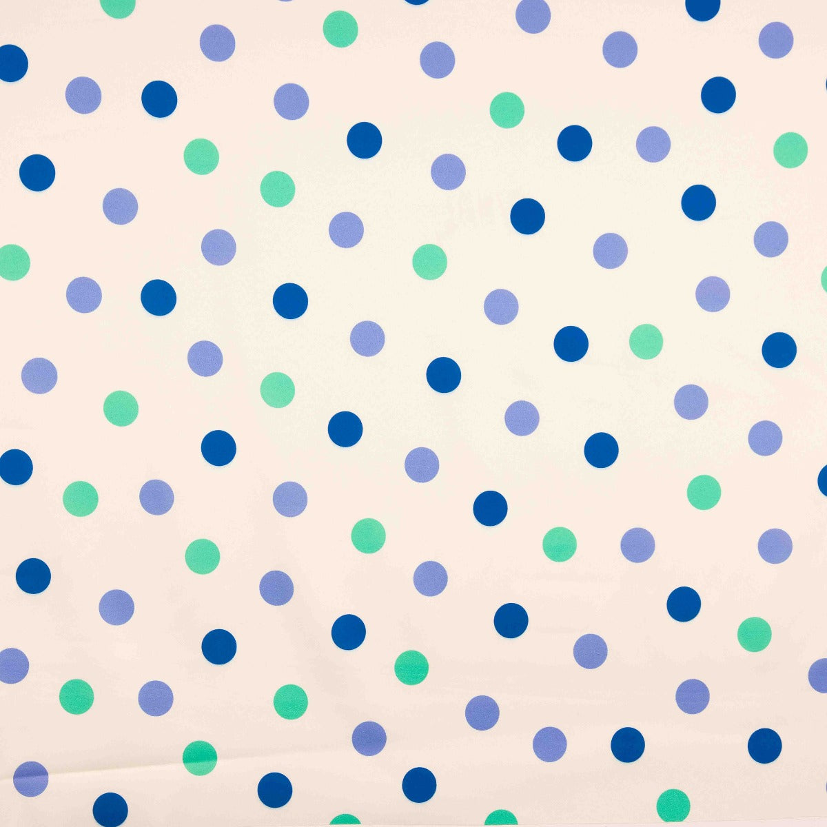 Tela de poliéster estampada con lunares de 3cm en tonos morado.