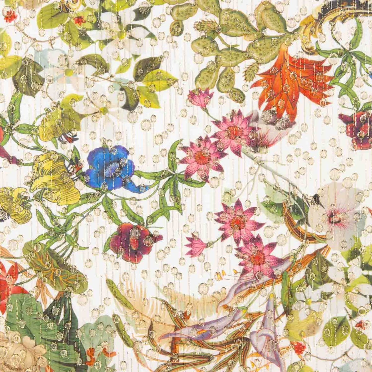 Las flores en tonos rojos, rosas, azules y amarillos se entrelazan sobre un lienzo claro, enriquecido con hilos dorados que aportan brillo vertical y una textura en relieve muy decorativa.