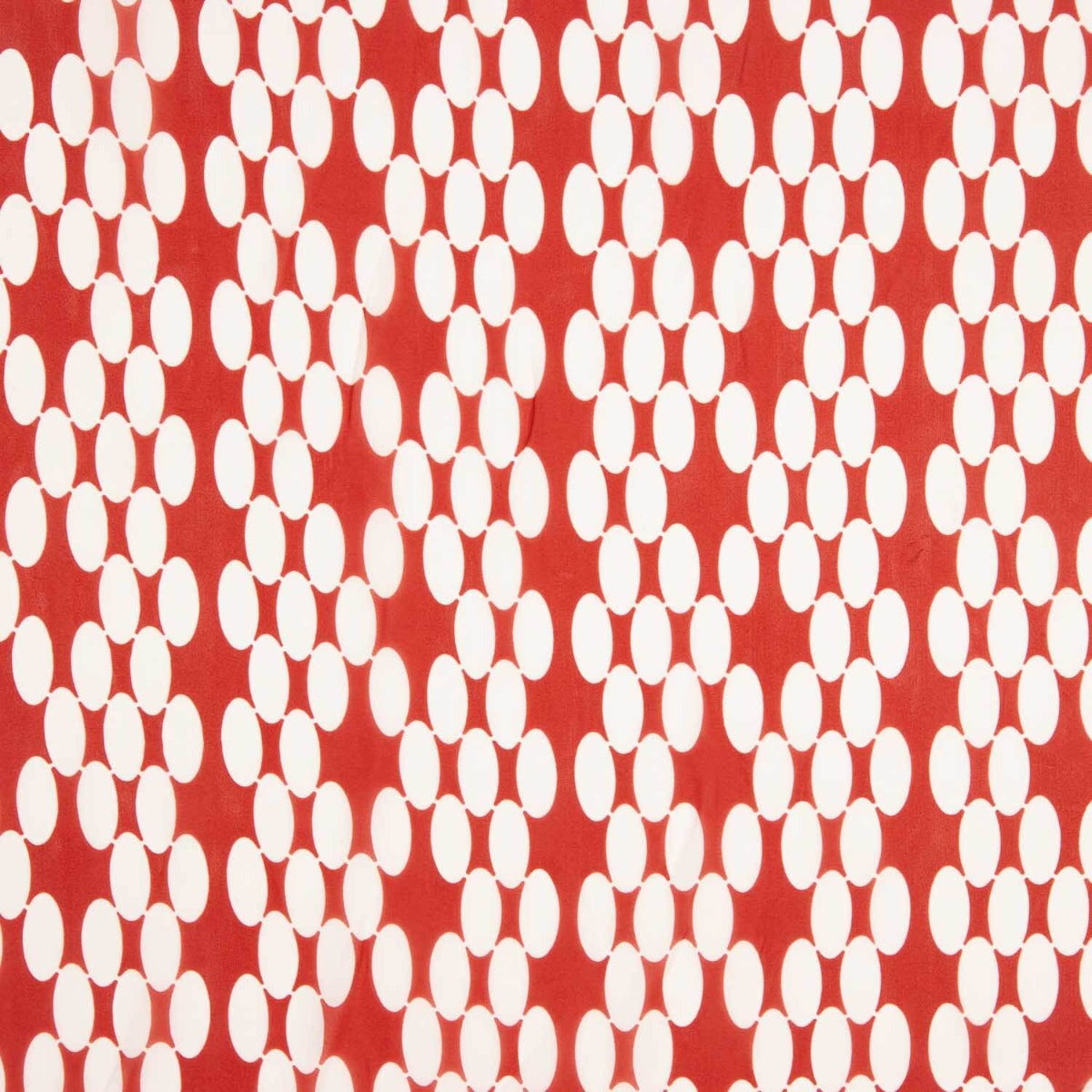 Aporta un aire fresco y moderno a tus creaciones con esta gasa de viscosa estampada, decorada con un dinámico patrón de lunares alargados blancos sobre un vibrante fondo rojo.