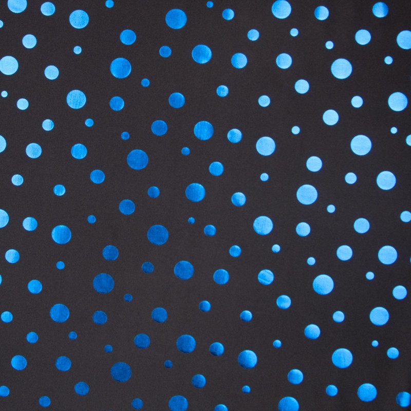 Comprar lycra para maillots con lámina brillante de lunares azul eléctrico sobre una base negra brillante. La lycra es una tela elástica muy fina y opaca a la vez, con gran resistencia al estiramiento. Contiene un porcentaje elevado de Spandex perfecto para prendas ajustadas al cuerpo. Con esta tela elástica te puedes hacer trajes y vestidos para espectáculos así como maillots de patinaje. También es ideal para disfraces y carnaval. El dibujo únicamente está en una cara de la tela.
