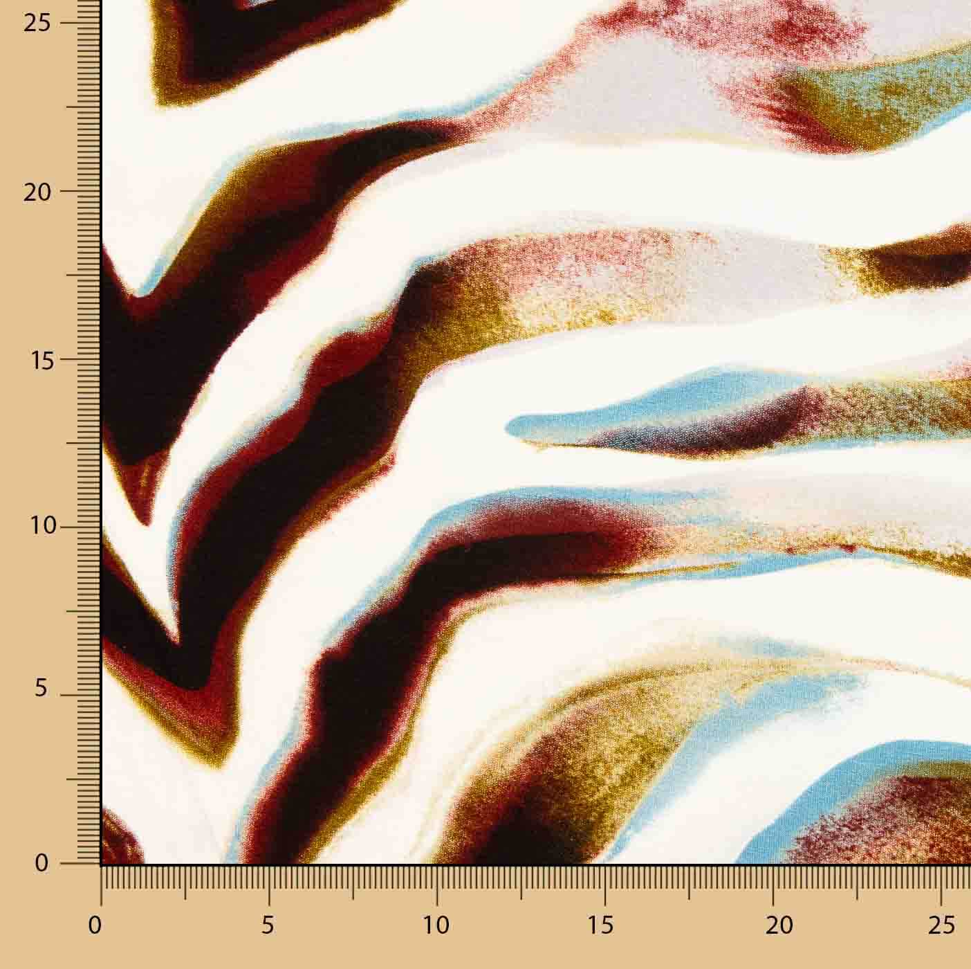O Malha Viscose Elastano Estampado Zebra Artística apresenta um design inspirado nos animais, com riscas maxi orgânicas em tons de castanho, bordô e nuances azuladas sobre fundo claro. Um estampado moderno e dinâmico que confere personalidade e estilo a qualquer peça de roupa.