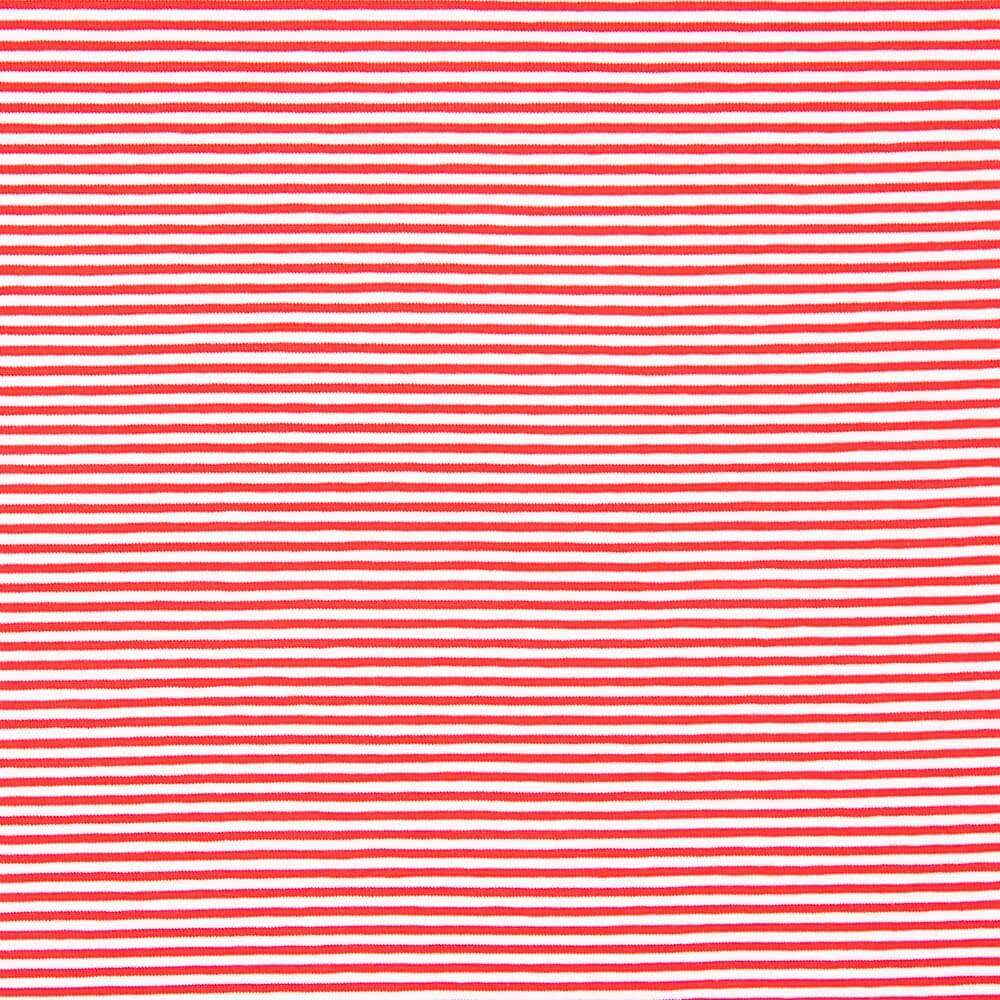 Tecido elástico de viscose para vestidos de mini listras vermelhas. Malha elástica com muito caimento, peso e textura muito suave e agradável ao tacto, com uma certa elasticidade proporcionada pela percentagem de elastómero que o tecido contém. Viscose elástica ideal para fazer vestidos de verão, camisetas e saias com ajuste total ao corpo. Estica na direção da largura do tecido.