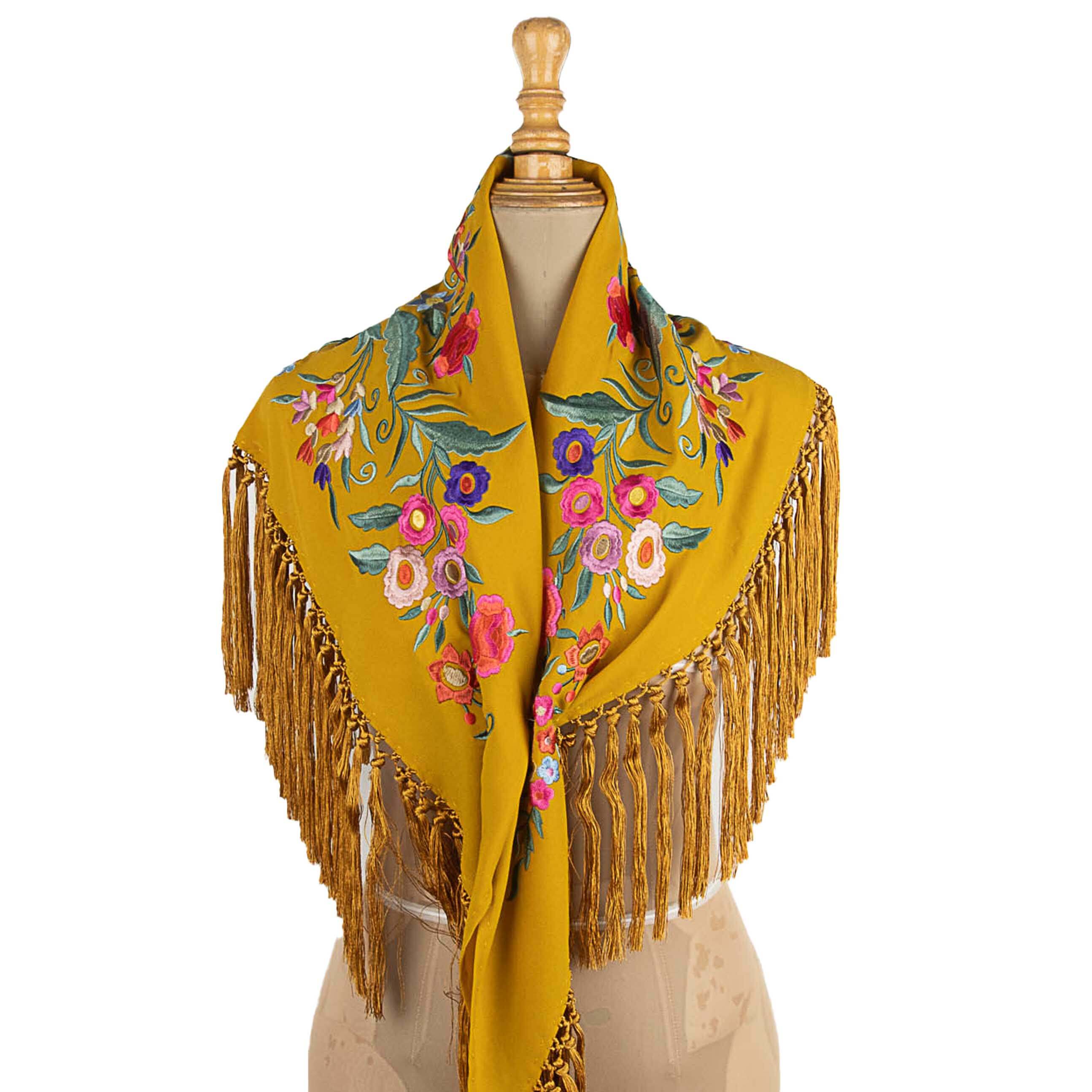 Este xale flamenco é confeccionado sobre uma base em cor albero, um tom quente e luminoso que realça o contraste do seu bordado multicolorido. Os seus motivos florais bordados conferem vida, textura e um estilo tradicional perfeito para completar qualquer traje flamenco ou look de feira.