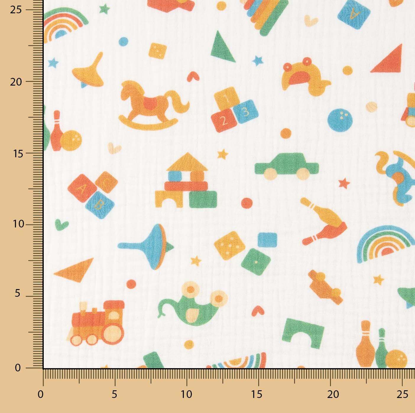 Tecido de musselina 100% algodão com alegre estampado de brinquedos infantis, arco-íris e formas geométricas em cores suaves sobre fundo branco.