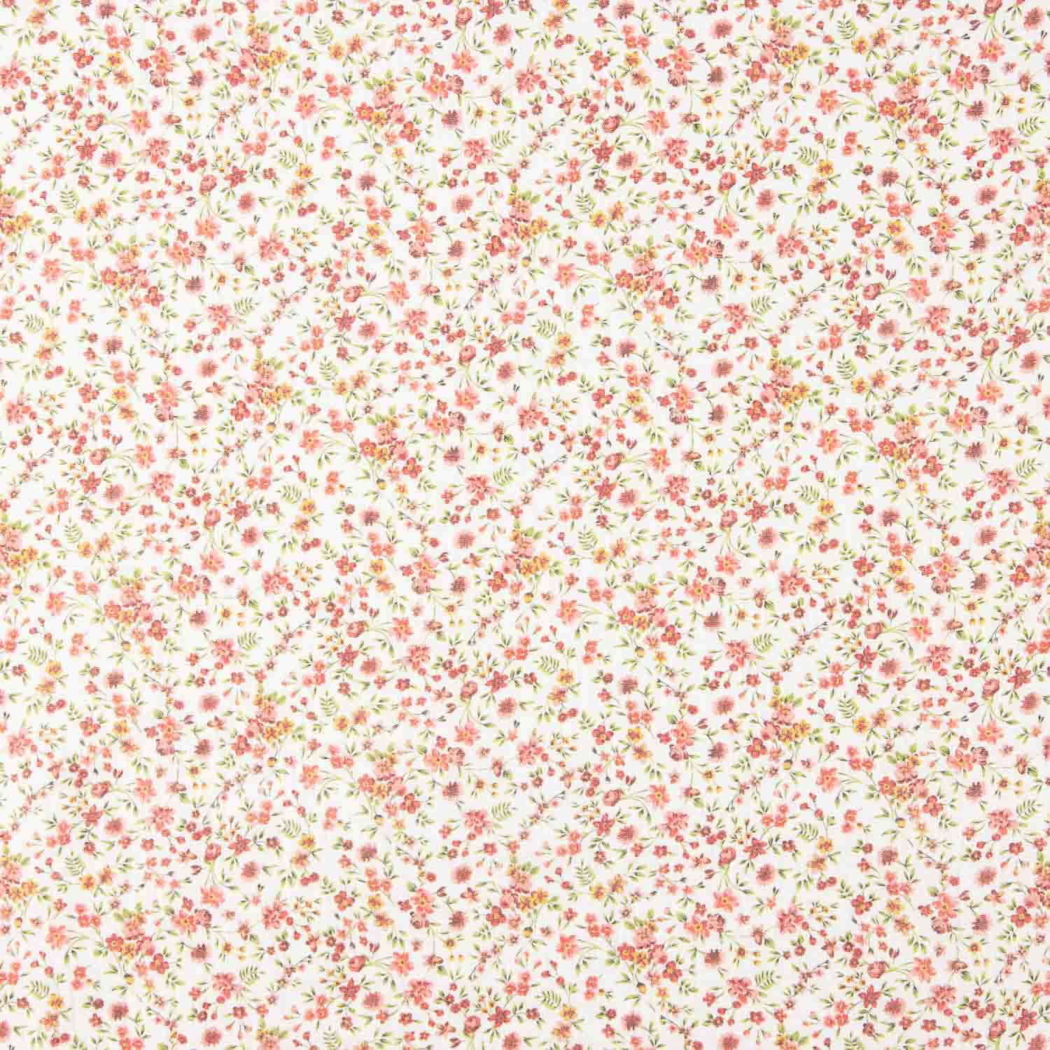 Tecido de musselina 100% algodão com delicado estampado de pequenas flores em tons de rosa sobre fundo branco.