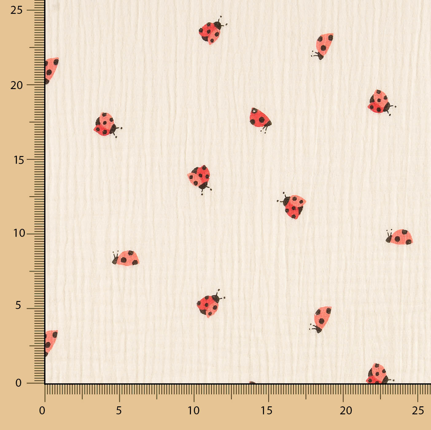 Musselina 100% algodão com um delicado estampado de joaninhas vermelhas sobre fundo cru. Um tecido leve, respirável e muito suave, ideal para roupas infantis e artigos para bebés.