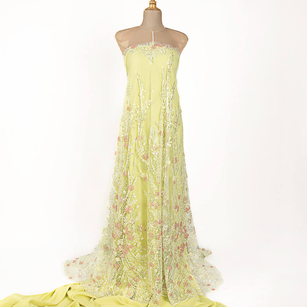Base de tul transparente de color lima pastel bordado con cristales y lentejuelas en tonos rosa y lima claro que aportan destellos y brillos de gran contraste a la luz.