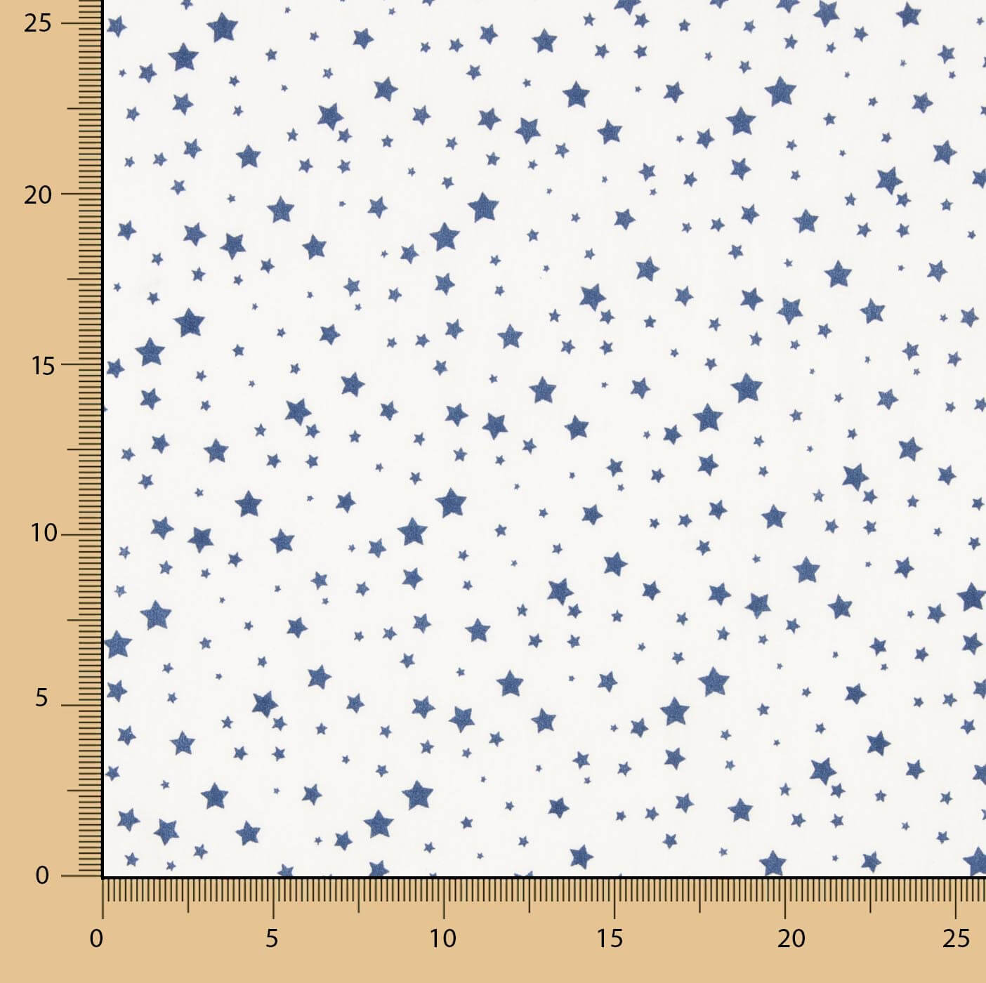 O tecido de percal 100% algodão com estampado de estrelas azuis sobre fundo branco é ideal para projetos criativos que procuram um design moderno, fresco e versátil. Este tecido com 140 cm de largura é suave ao toque, respirável e resistente, perfeito para roupas infantis, lençóis, decoração e artesanato.