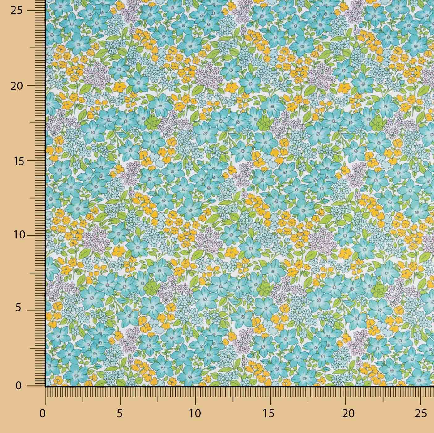 Composição: 100% algodão | Qualidade: Percal 200 fios | Largura: 140 cm | Estampagem: Digital de alta definição | Design: Floral em tons de verde água e amarelo sobre fundo claro | Usos: Lençóis, capas de edredão, camisas, vestidos, blusas, almofadas e decoração