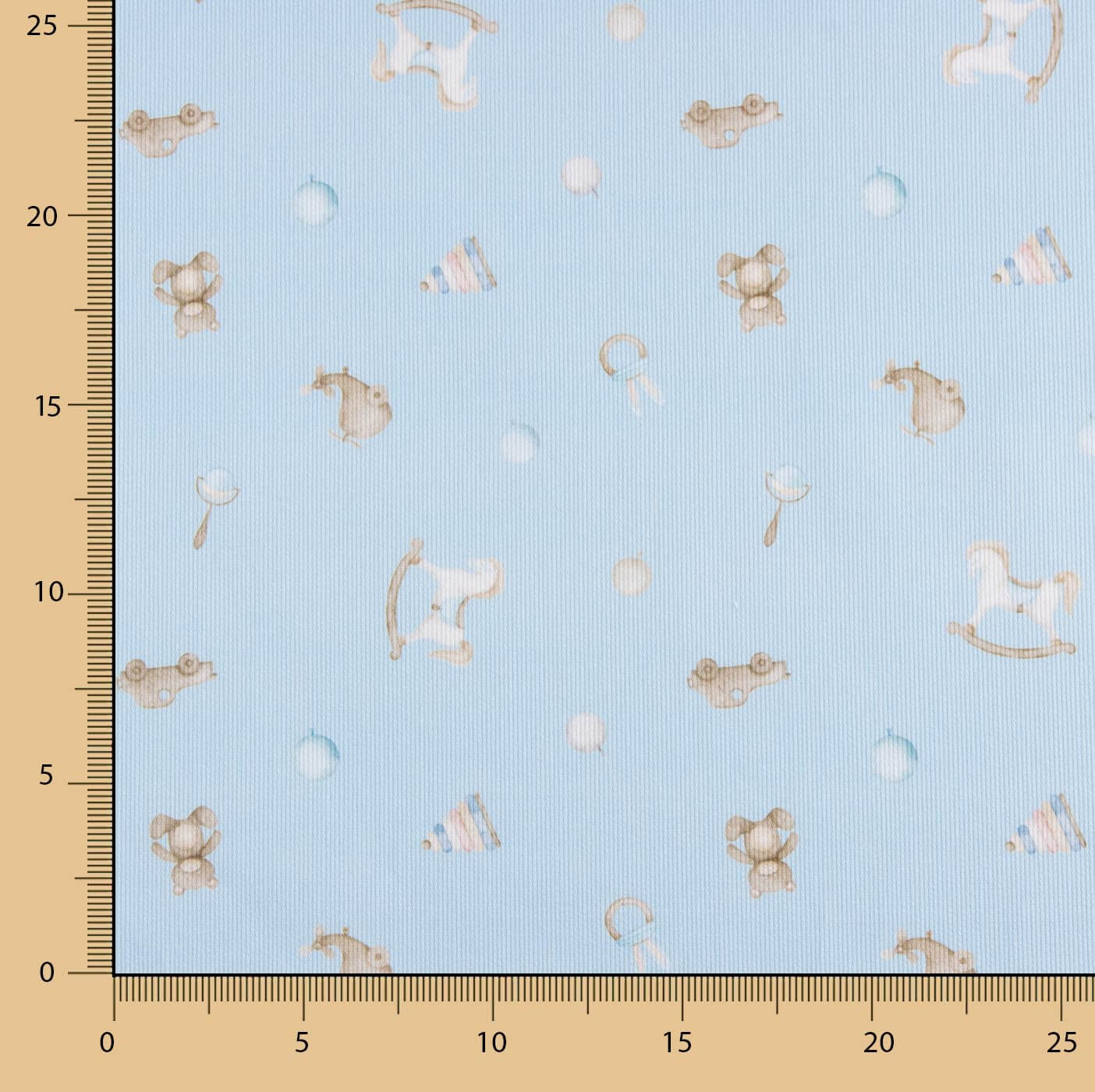 Tecido piqué 100% algodão com um encantador estampado de pequenos brinquedos de bebé em tons de bege e azul suave sobre fundo azul celeste. O tecido piqué caracteriza-se pela sua textura ligeiramente em relevo, fresca, respirável e com corpo, ideal para peças de vestuário confortáveis e com estrutura. O seu design doce e delicado é perfeito para confeção infantil, moda para bebés e acessórios para recém-nascidos. Ideal para a confeção de vestidos, camisas, macacões, conjuntos para bebés, peluches, mantas, almofadas infantis e acessórios. Composição: 100% algodão | Largura: 150 cm | Tipo de tecido: Piqué | Estampado: Brinquedos para bebé azul celeste | Utilização: Moda infantil e confeção.