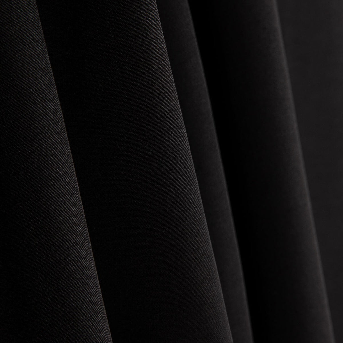 La tela plana bielástica negra combina un 74% de viscosa, 22% de poliéster y 4% de elastano, ofreciendo un tejido con cuerpo, adaptable y cómodo.