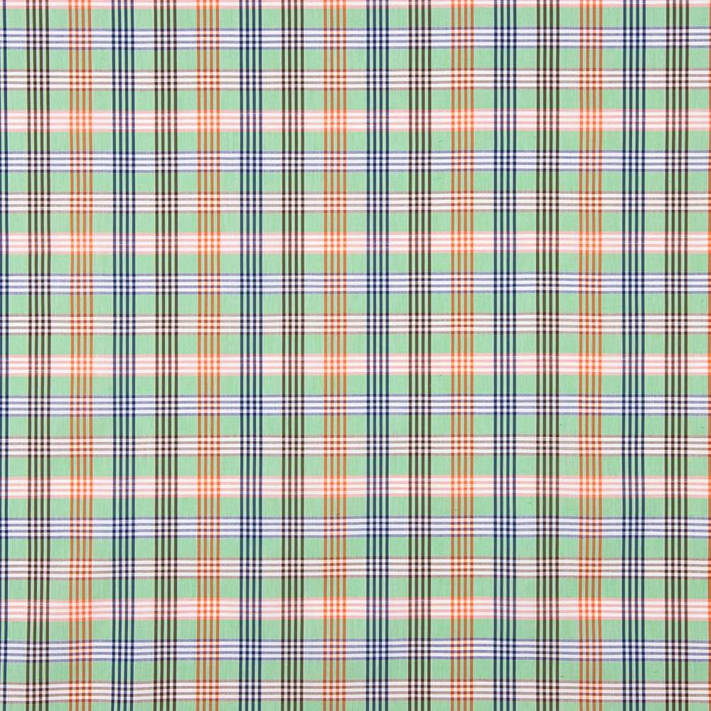 Tela de popelín de algodón para camisería en cuádruple raya de color formando cuadros en combinación de color sobre tono verde de fondo.
