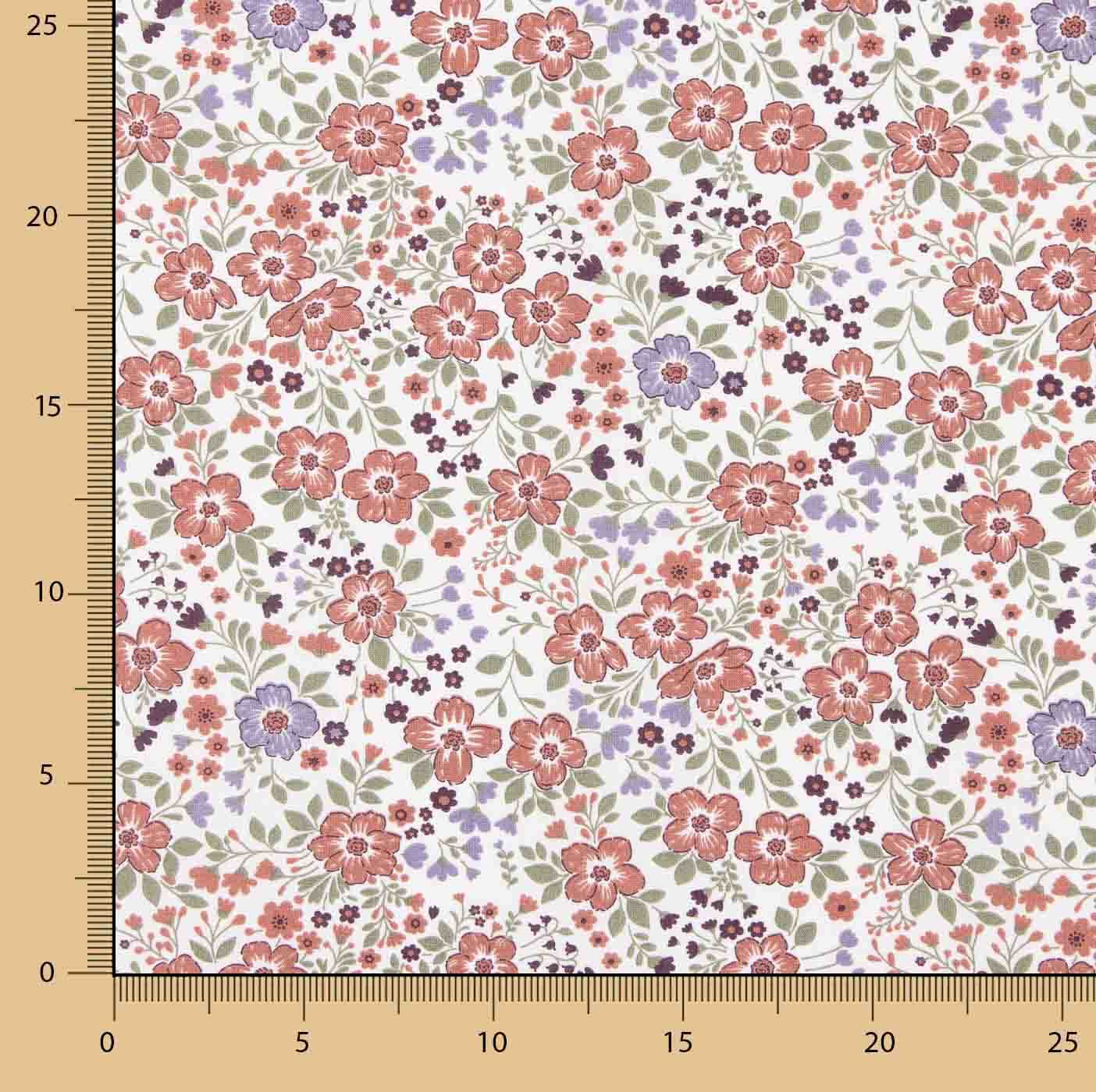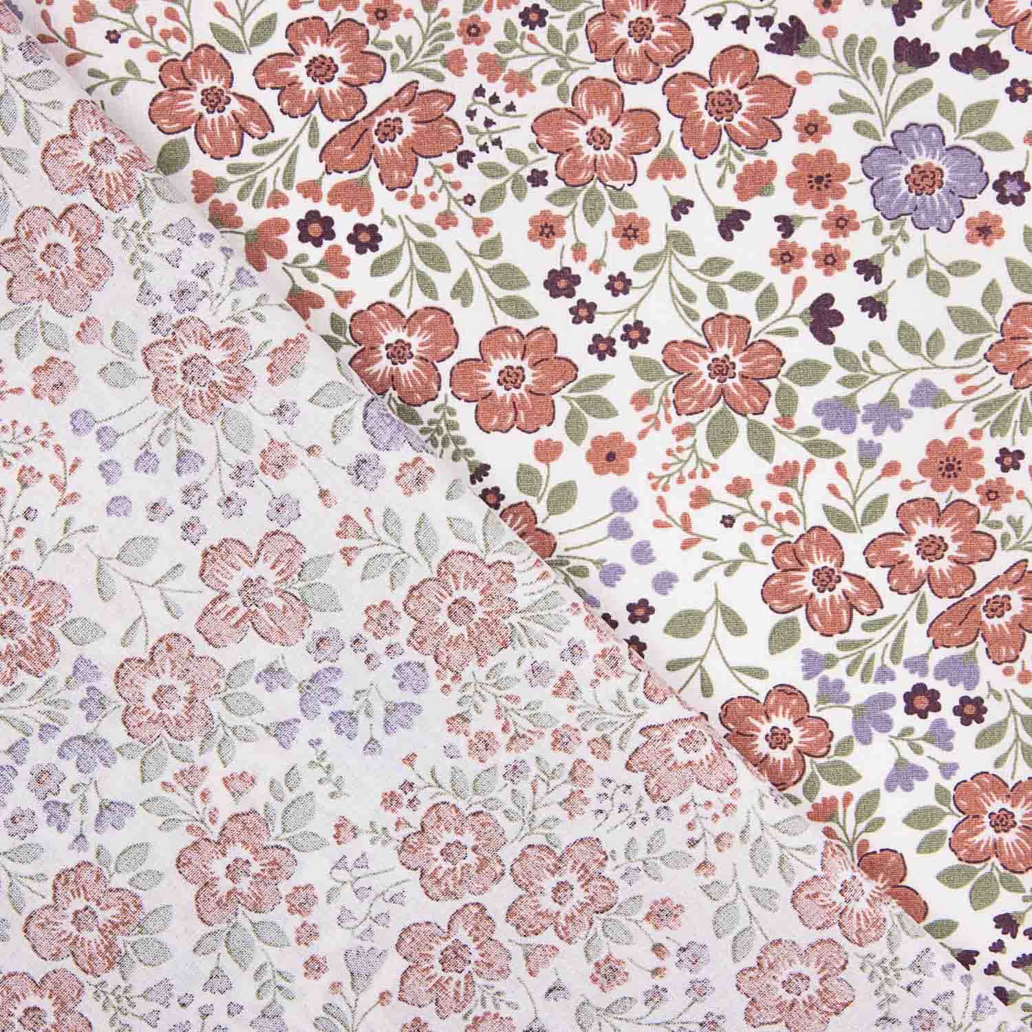 O Popeline de Algodão Estampado com Flores Lilás e Tijolo combina pequenas flores em tons de tijolo, lilás e verde oliva sobre um fundo claro, criando um design delicado, harmonioso e intemporal. Um estampado floral versátil, perfeito para confecções femininas e peças com um toque romântico.