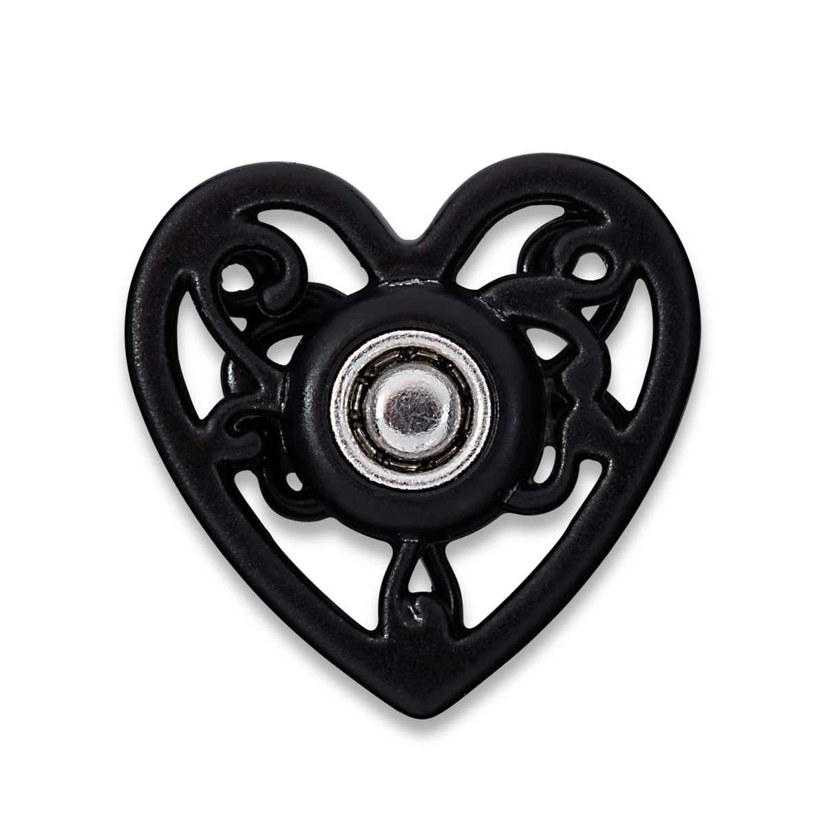 Fecho de pressão de latão e zinco 18 mm, em forma de coração preto. Perfeito para personalizar os botões de pressão das nossas roupas, o mecanismo é o mesmo que para um botão de pressão. Você pode cobri-lo com lã ou outra fibra. Vendido em embalagens de 2 unidades.