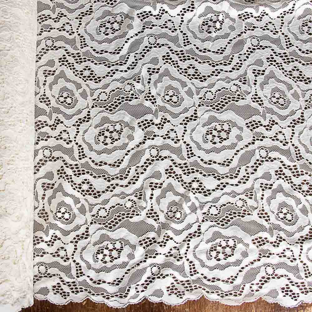 Ancho de 1.30cm con acabado en blonda en ambos extremos. Puedes aprovechar la puntilla de los orillos para terminar tu prenda en bajos, escote o mangas.