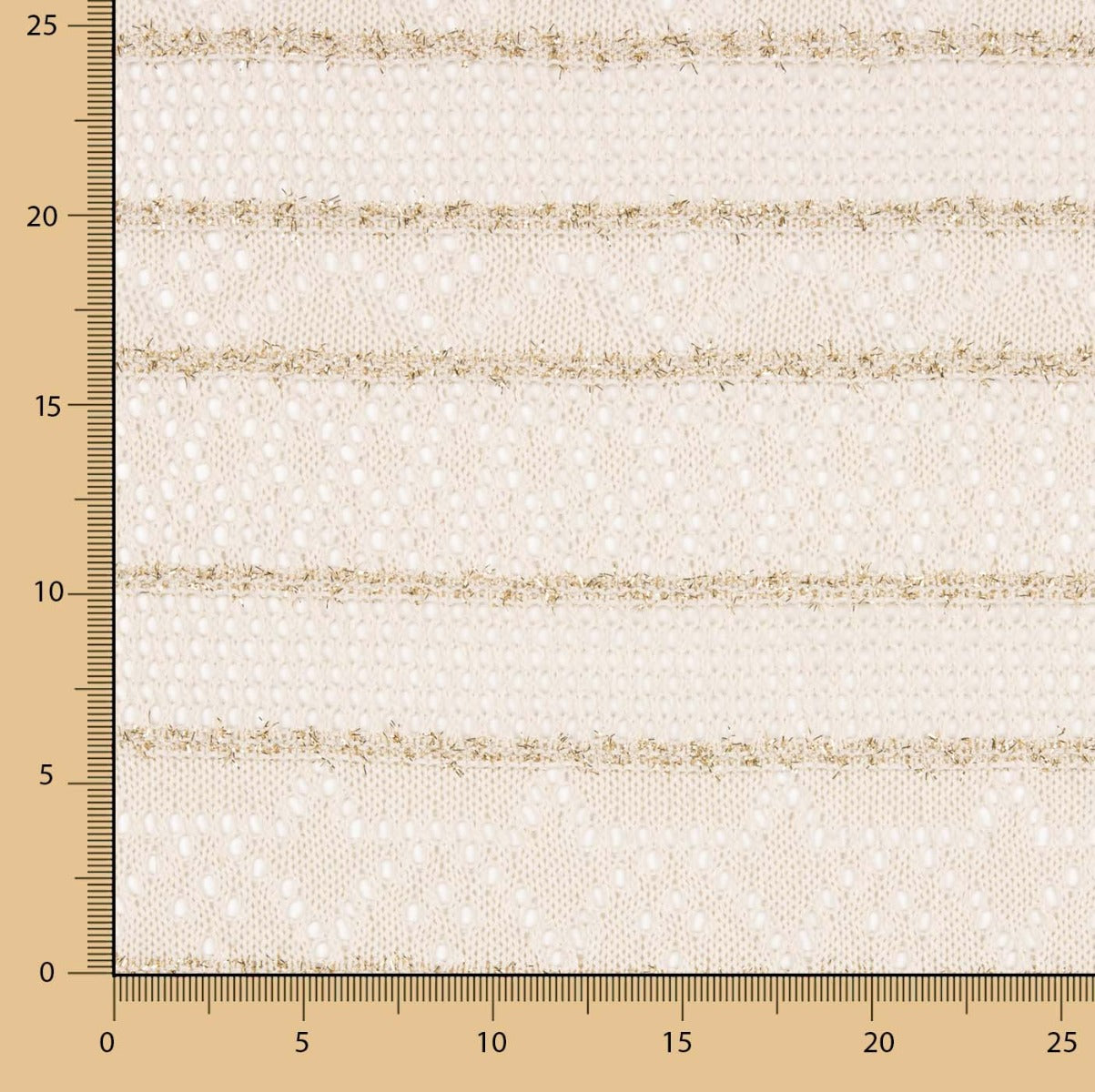 Su patrón calado, ligeramente diferente al modelo clásico, añade dinamismo visual, mientras que las líneas de lurex crean una textura brillante que capta la luz y realza cualquier prenda o elemento decorativo.