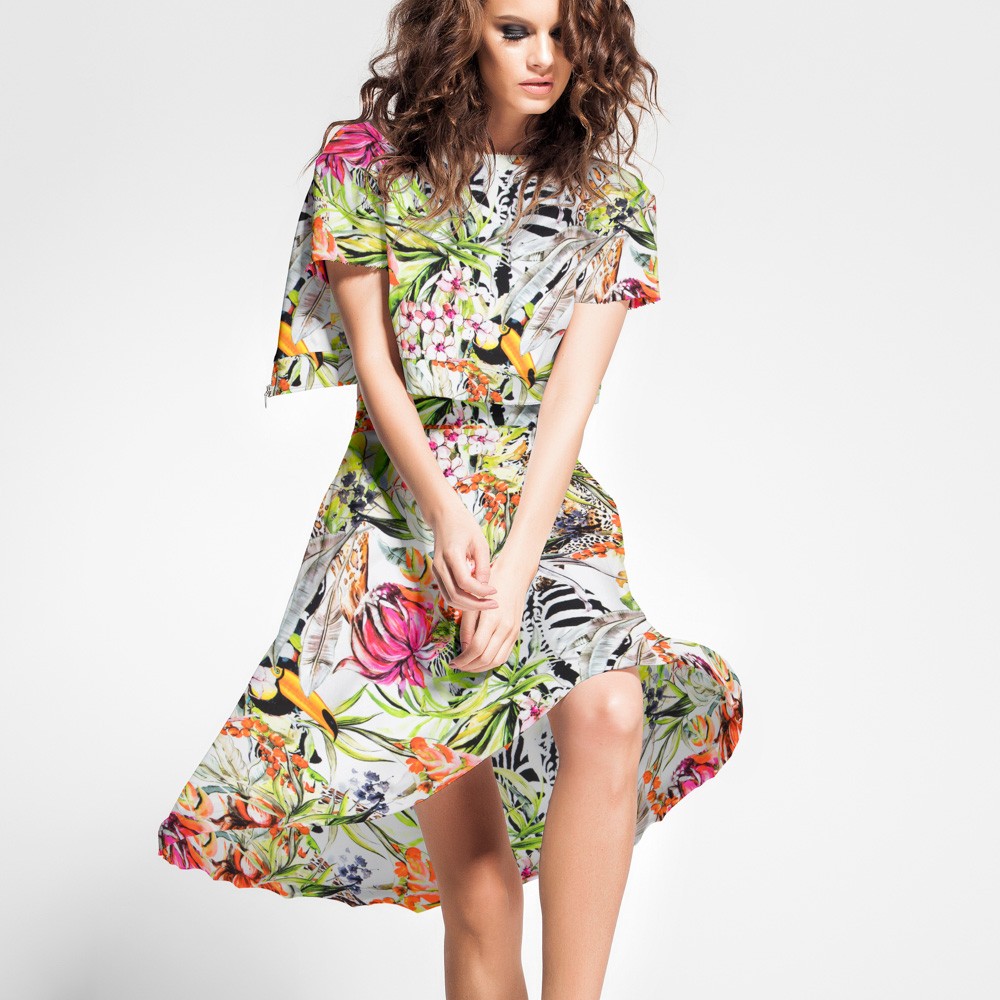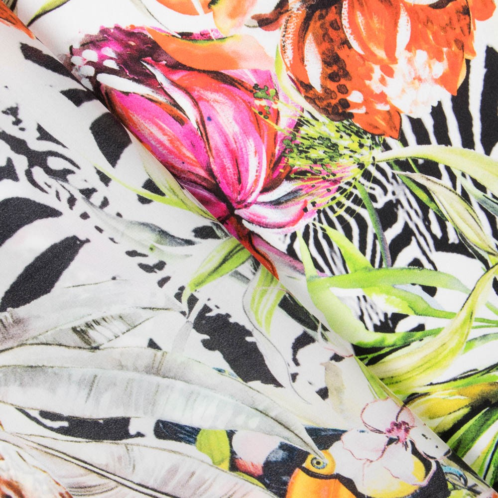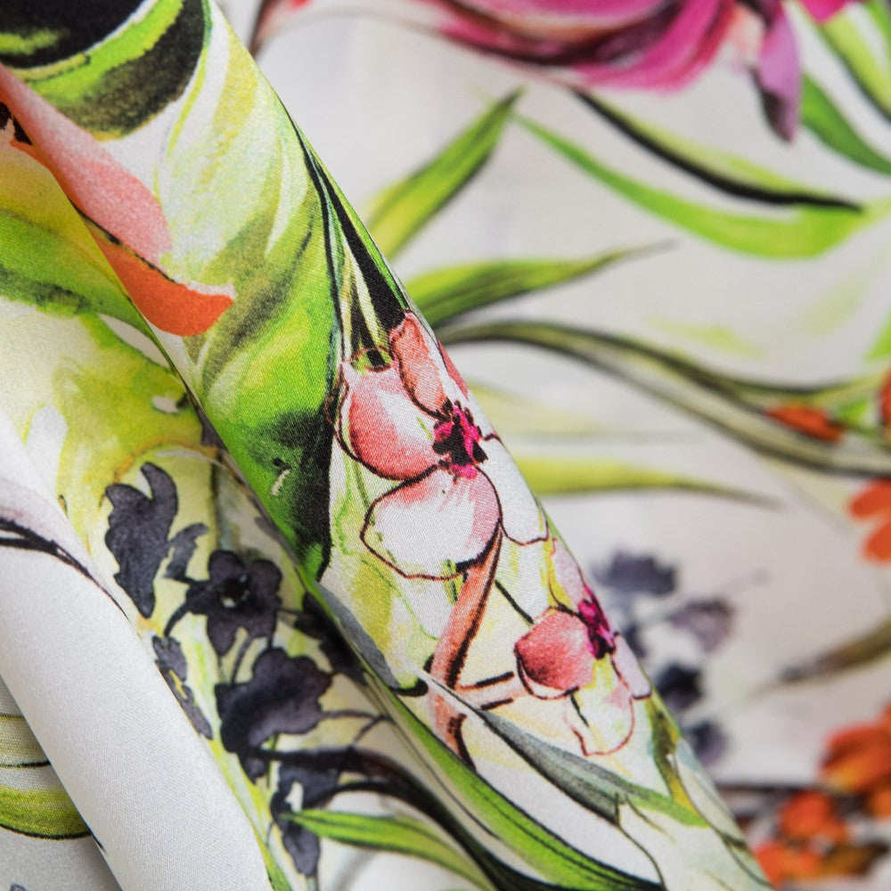 Seda natural de gran calidad con estampado muy original que combina el animal print y las flores. La seda italiana, sin duda es una de las telas más cotizadas y exclusivas en el mundo de la moda. Tela de textura sedosa, especialmente suave y agradable al tacto, con una caída muy característica y elegante. Satén de seda 100% natural para confeccionar vestidos, faldas, blusas, kimonos y todo tipo de prendas de moda, ya sea casual o para ceremonias.