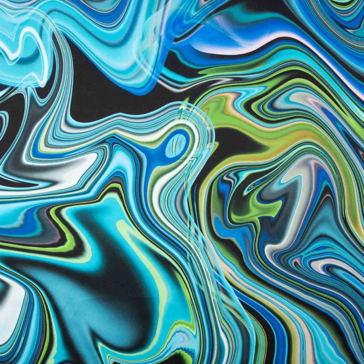 El diseño imita vetas de mármol en movimiento con ondas hipnóticas en tonos azules, verdes, negros y toques de blanco y gris, logrando un efecto visual impactante.