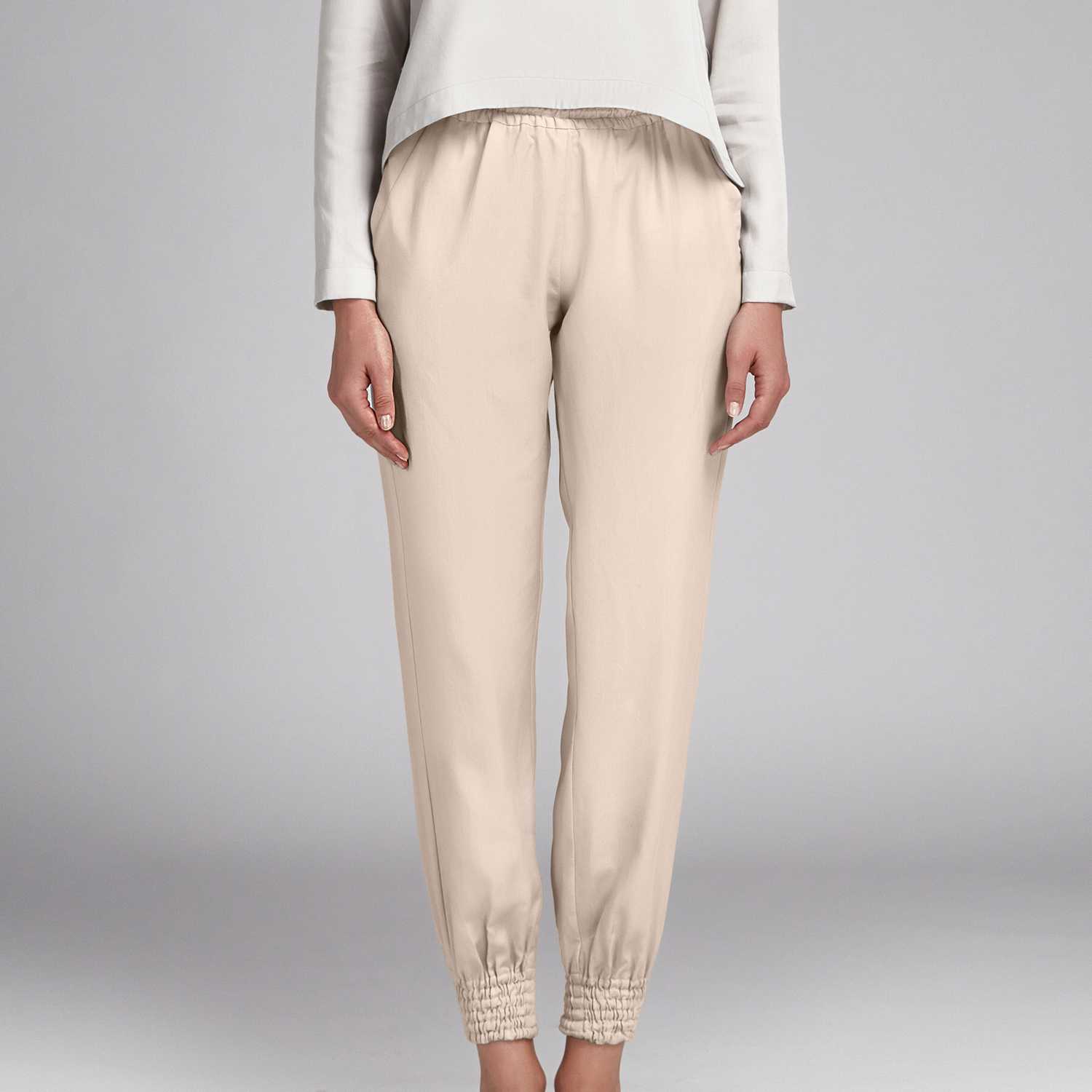 Cetim de poliéster bege. Tecido acetinado, com textura suave, caimento e movimento. Perfeito para fazer blusas, vestidos, saias e lenços.