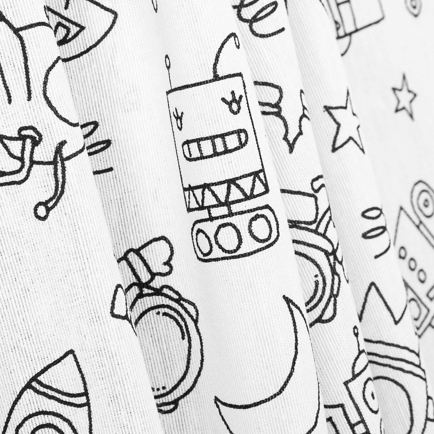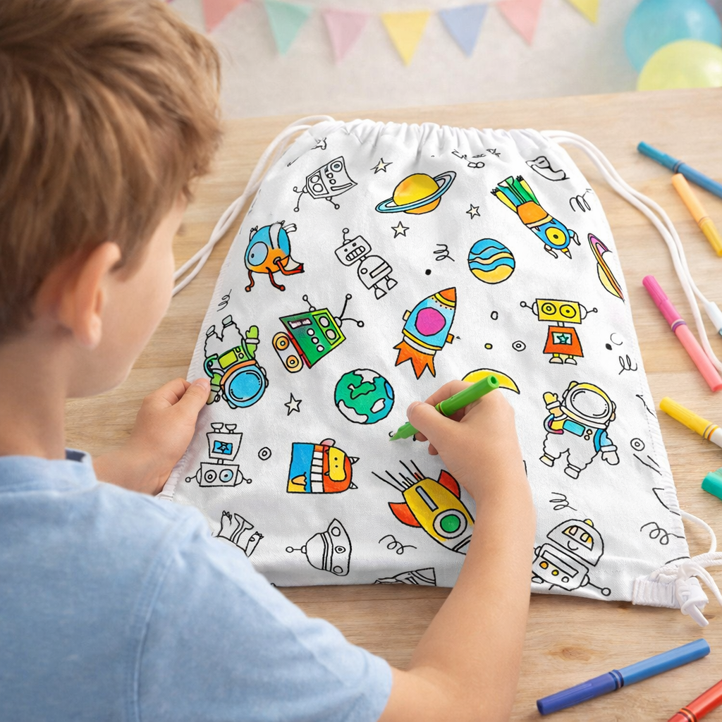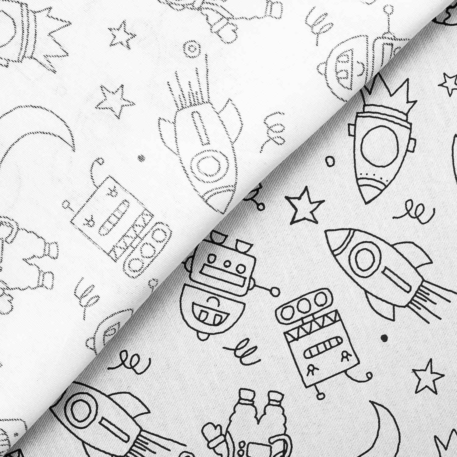 A tela fina Space para pintar é um tecido criativo concebido para artesanato e atividades infantis. O seu divertido padrão branco com desenhos de foguetes, astronautas, robôs, planetas e estrelas permite que as crianças possam colorir e personalizar a tela utilizando marcadores têxteis.