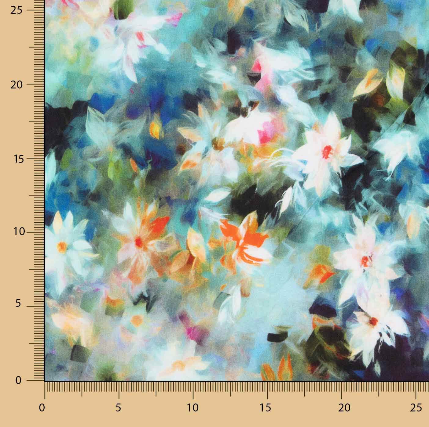 O tecido de viscose estampado floral é um tecido leve, fresco e com um caimento fluido, ideal para a confecção de peças de moda elegantes e confortáveis. Este design apresenta um estampado floral artístico multicolorido com tons de azul, verde, branco e pinceladas quentes que criam um efeito visual moderno, dinâmico e muito atraente.
