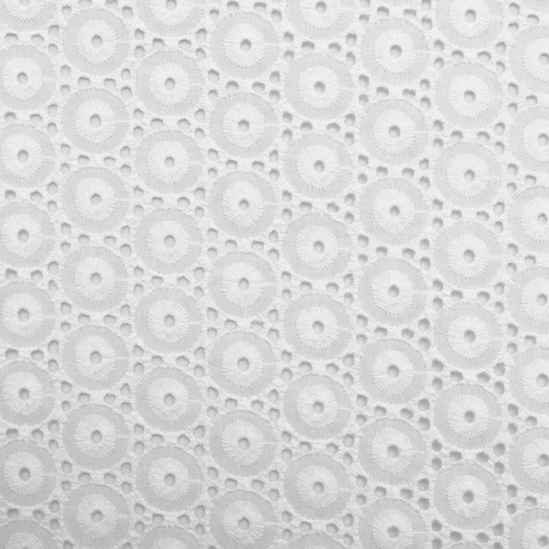 tecido com bordado suíço de losangos com um círculo interior perfurado de cor branca. Bordado flamenco de algodão fino, resistente e com relevo criado pelo próprio bordado. Tecido ideal para a confecção de trajes de sevilhana, aplicações e plissados ??de flamenco.