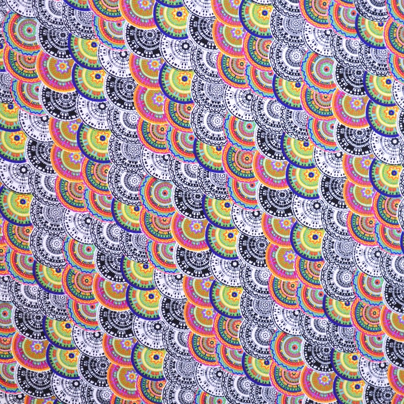 Tecido de crepe estampado étnico sobre um fundo branco. Crepe opaco, muito esvoaçante e fluído, de textura áspera ao toque que lembra o Crespão e o Koshibo mas de qualidade superior. Tecido ideal para a confecção de trajes de flamenco, blusas, vestidos e saias.