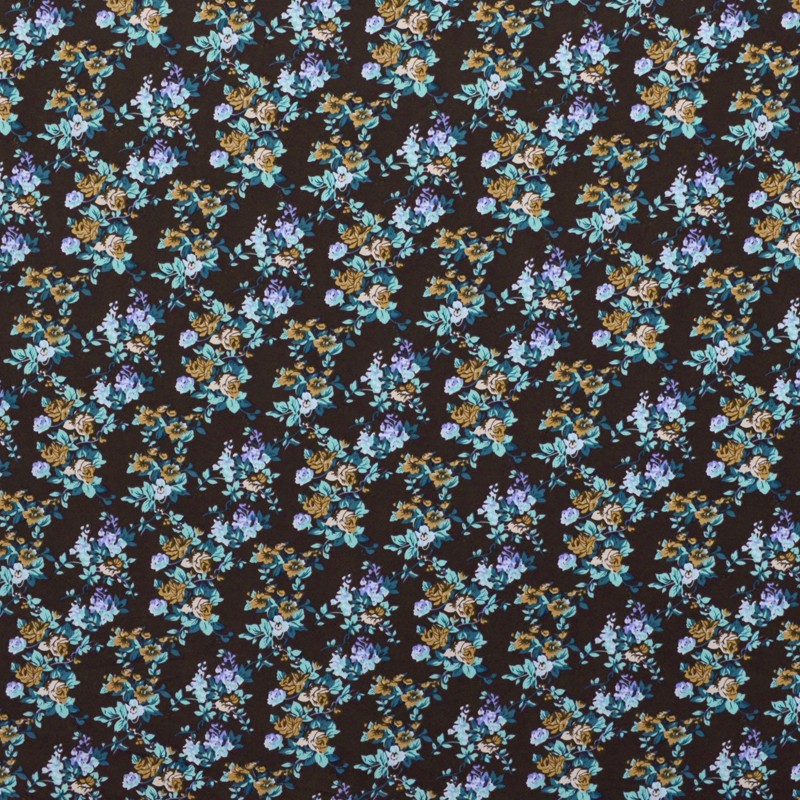 Tecido de crepe com padrão de flores de tamanho médio sobre um fundo castanho chocolate. Crepe opaco, muito esvoaçante e fluído, de textura áspera ao toque que lembra o Crespão e o Koshibo mas de qualidade superior. Tecido ideal para a confecção de trajes de flamenco, blusas, vestidos e saias.