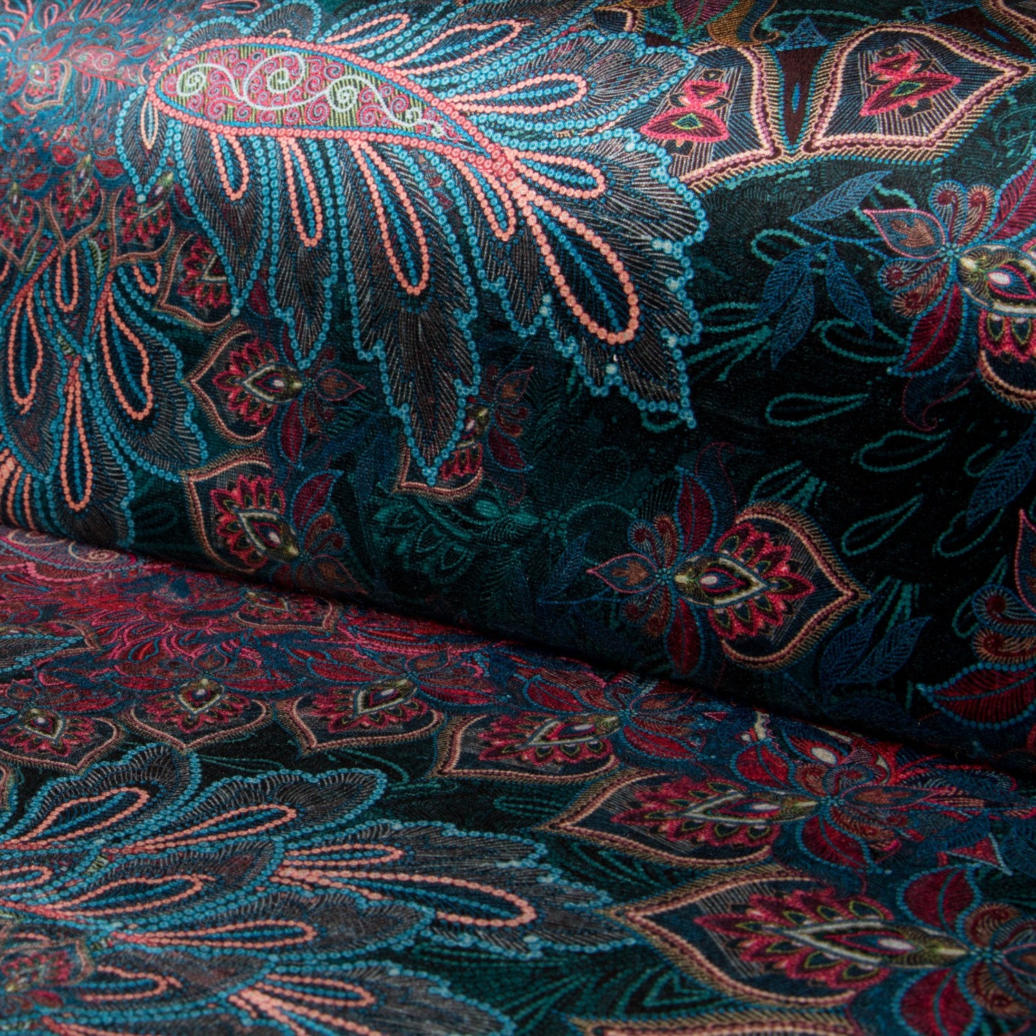 Comprar tela de terciopelo estampado de flores sobre fondo granate. El terciopelo martelé es una tela fina y con mucha caída, de textura muy suave y aterciopelada formando unas aguas. Con el terciopelo puedes hacer vestidos ajustados de fiesta, faldas e incluso pantalones.