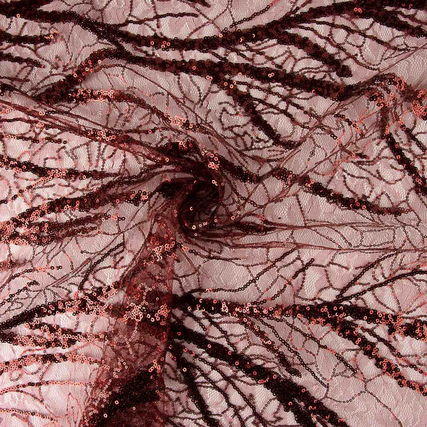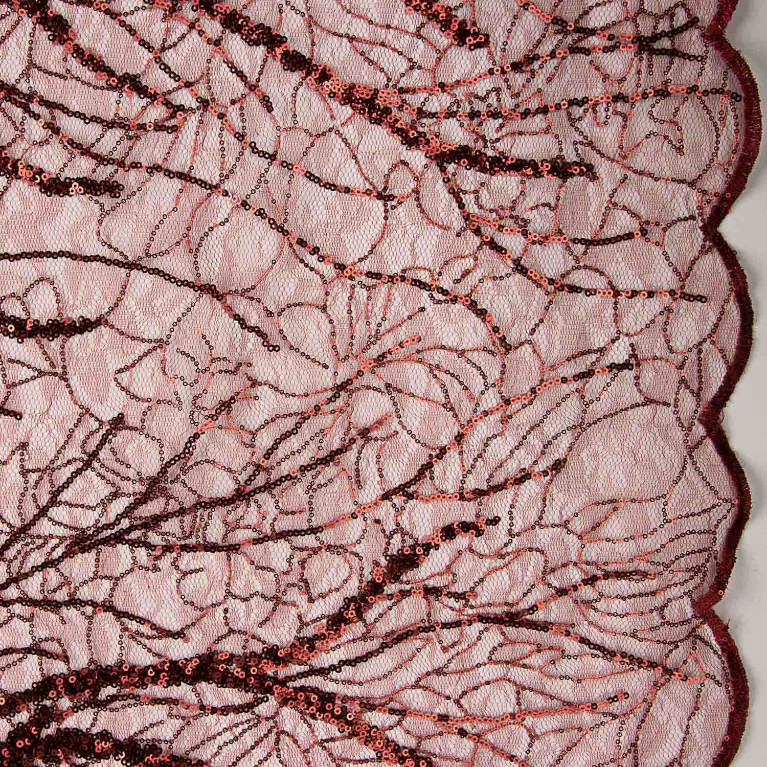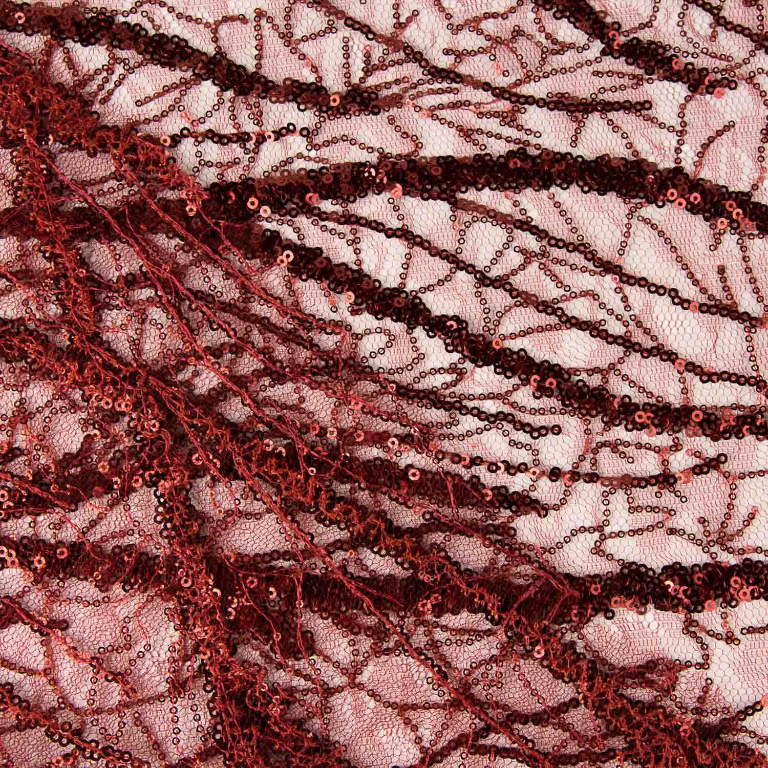 Tecido de tule fantasia na cor vermelha com desenho de lantejoulas formando motivos orgânicos e linhas decorativas que conferem brilho intenso e efeito cénico.