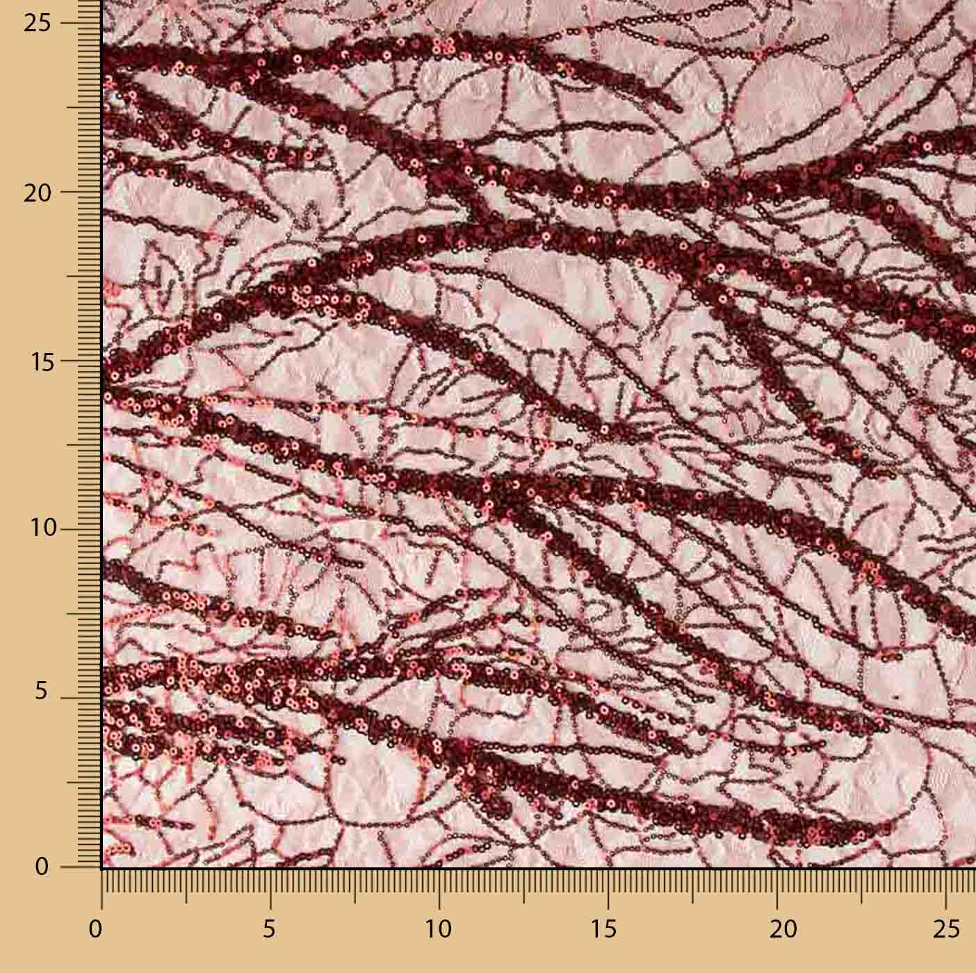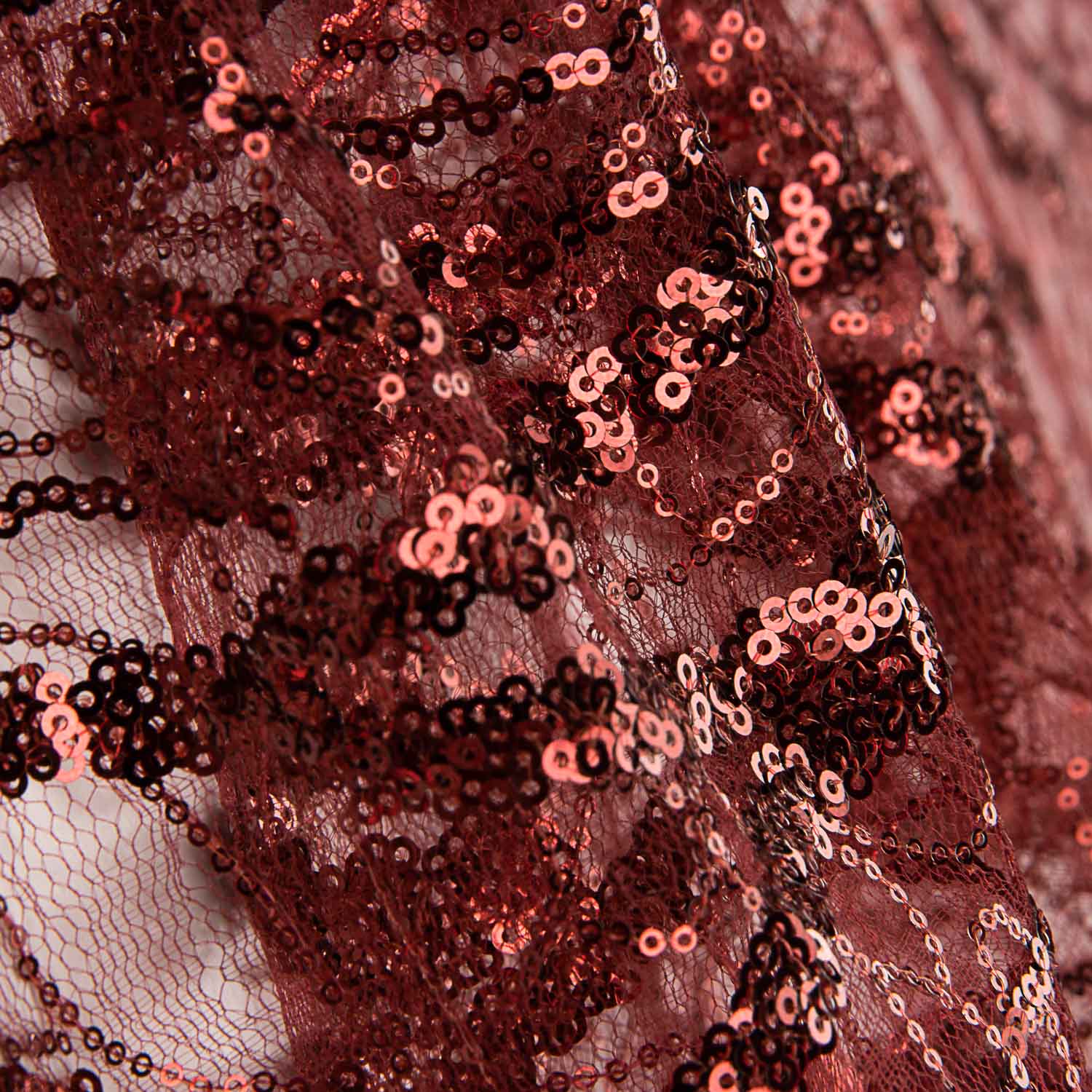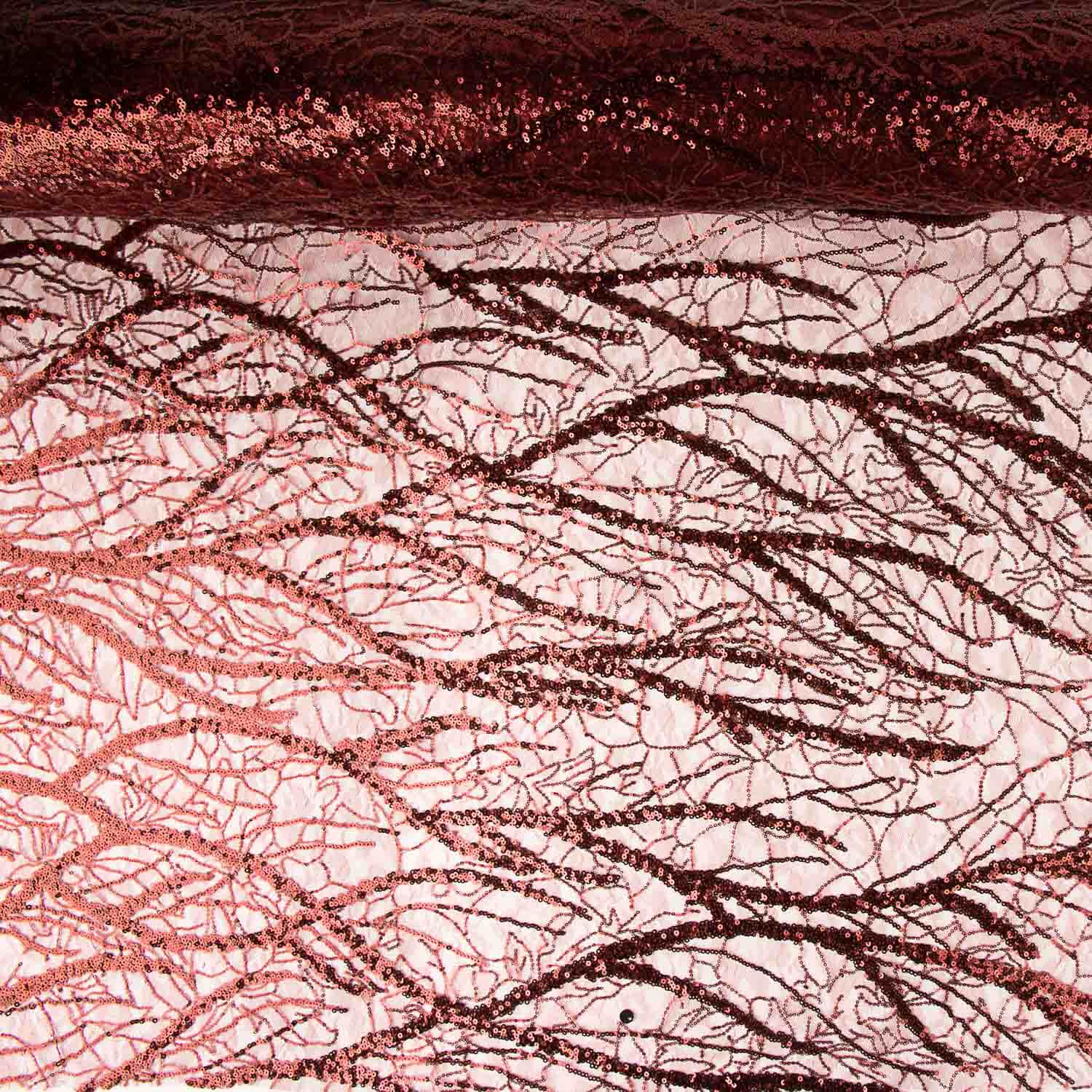 Tecido de tule fantasia na cor vermelha com desenho de lantejoulas formando motivos orgânicos e linhas decorativas que conferem brilho intenso e efeito cénico.