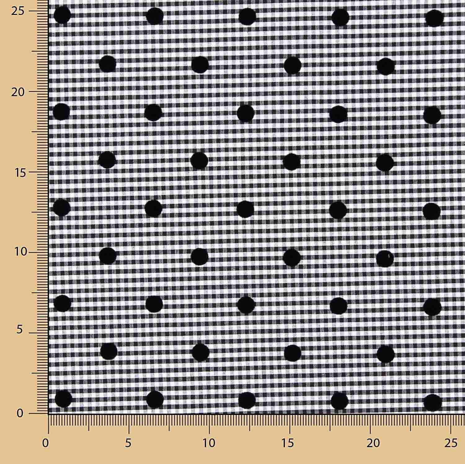 Tecido 100% algodão tipo vichy, especialmente concebido para moda flamenca. Apresenta um clássico padrão vichy em tons de preto e branco, sobre o qual se destaca um elegante flocado lunar em preto que confere textura, profundidade e um acabamento sofisticado. O motivo vegetal de inspiração tradicional percorre a superfície de forma equilibrada, criando um contraste muito atraente entre o fundo xadrez e o relevo aveludado do flocado. Este efeito realça o tecido e confere-lhe um caráter artesanal e andaluz, ideal para designs com personalidade. Graças à qualidade do algodão, é um tecido fresco, respirável e confortável, perfeito para vestidos de sevillana, trajes de rociera, saias, corpetes e conjuntos flamencos. O flocado acrescenta um toque de distinção que o torna ideal tanto para feiras como para romarias e eventos tradicionais. Um tecido com um toque clássico e um ar renovado, pensado para quem procura tecidos flamencos diferentes, com presença e elegância.