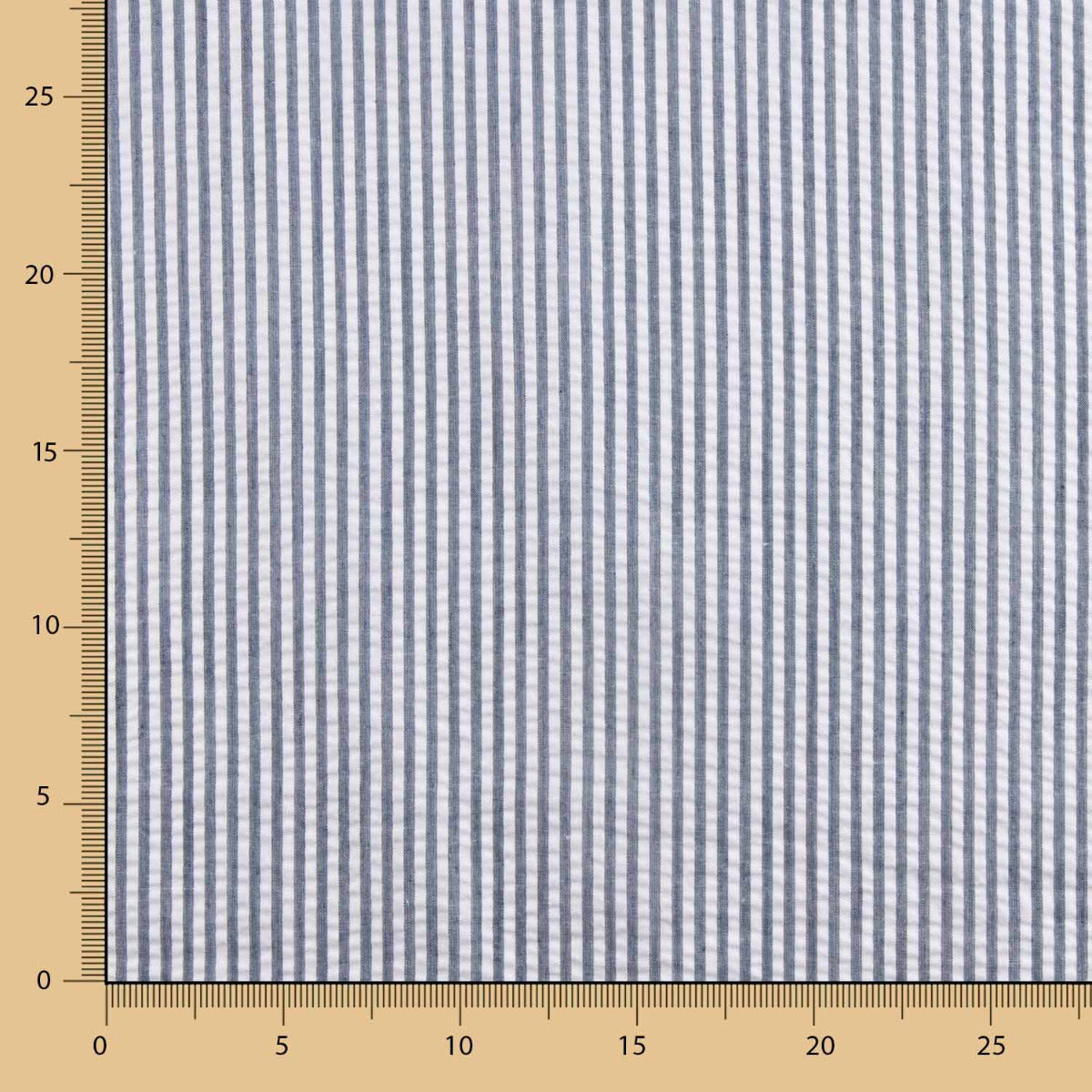 Tecido Vichy Sersuker Listras Marinho. Tecido de poliéster/algodão com listras Vichy em azul-marinho. O tecido Sersuker tem uma textura inconfundível que dá um efeito enrugado muito característico. É normalmente um tecido de Verão, respirável devido à geometria da sua trama. É muito prático, uma vez que não requer engomagem. Tecido de mistura muito versátil, macio, fino e sustentado. Tecido ideal para vestuário ligeiro e infantil, acessórios, decoração de casa. Dê um toque romântico ao seu projecto de costura, combinando este tecido com a nossa colecção de linho, que pode ver neste link.