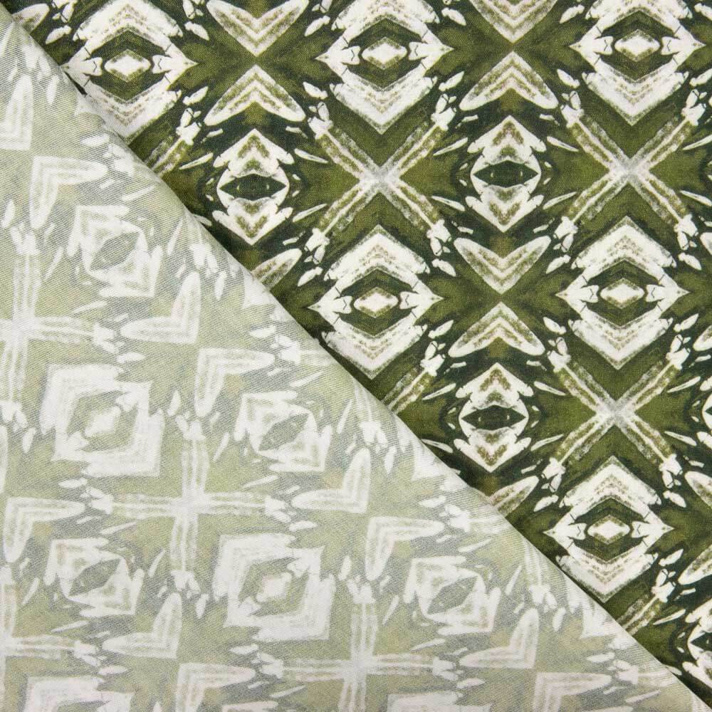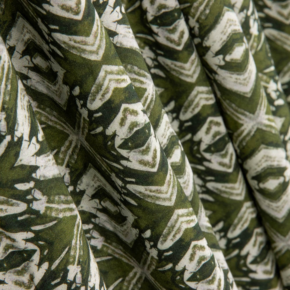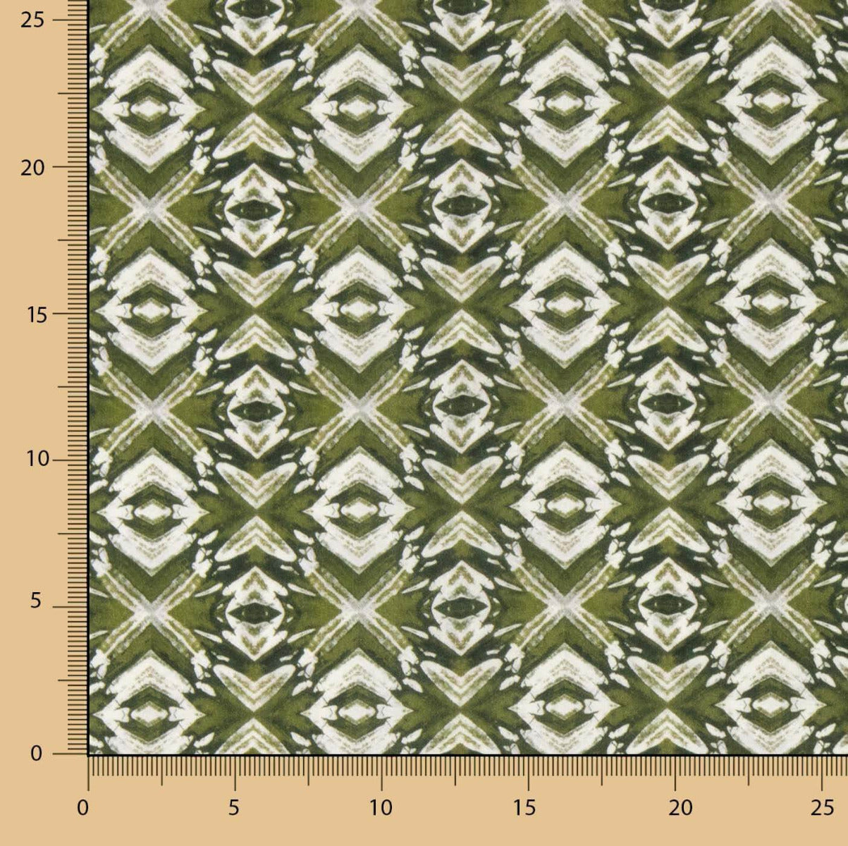 Tela de viscosa estampado étnico verde caza, tela con caída, muy fluida y sedosa.La viscosa es una tela fina que se caracteriza por el vuelo y la caída, con una textura suave y fresca. Tela de viscosa lisa con la que puedes hacerte vestidos, faldas, pantalones palazzo, jumpsuits y todo tipo de prendas de moda.Una tela que sin duda será tendencia para esta temporada. Al ser un tejido 100% viscosa, recomendamos un lavado previo a ser manipulado.