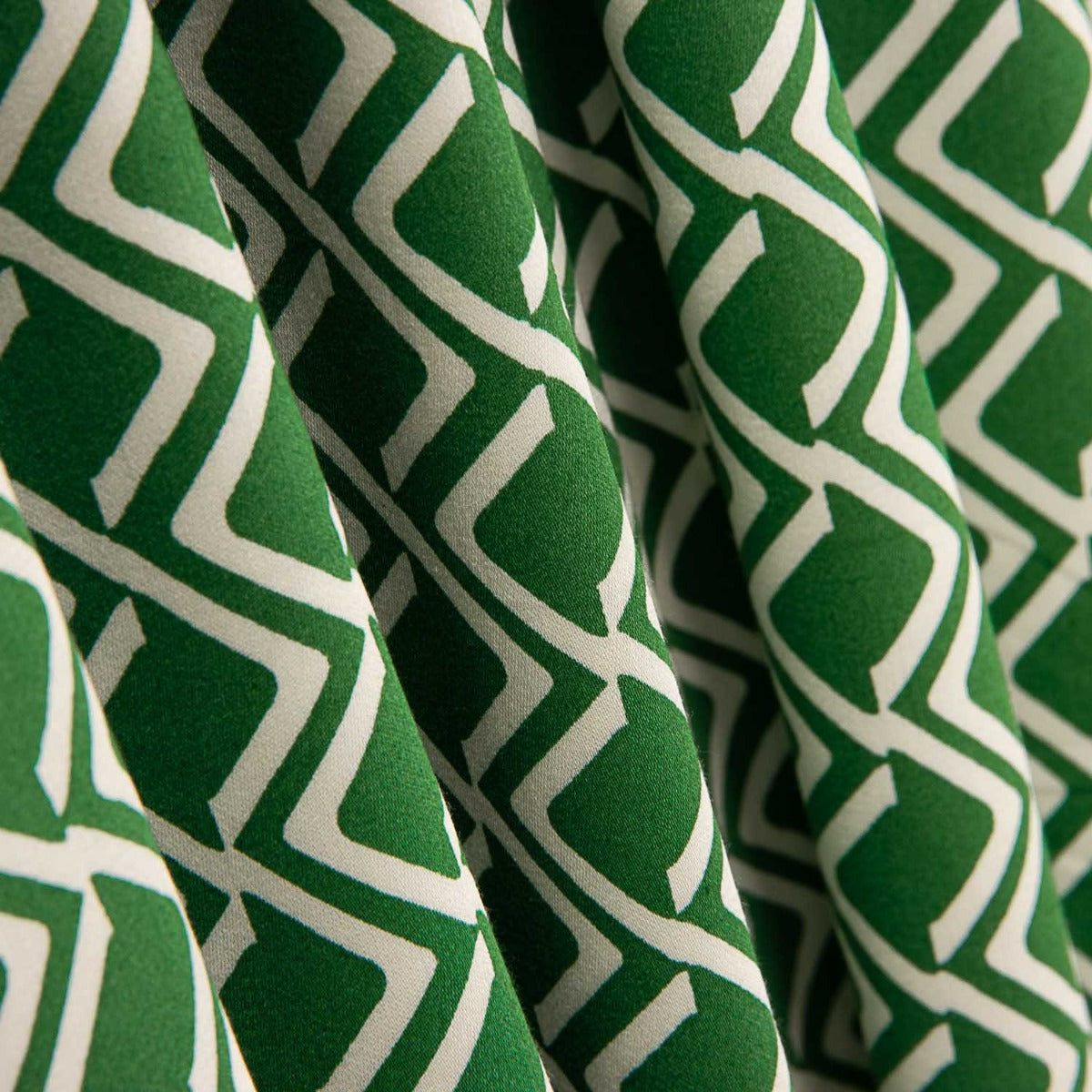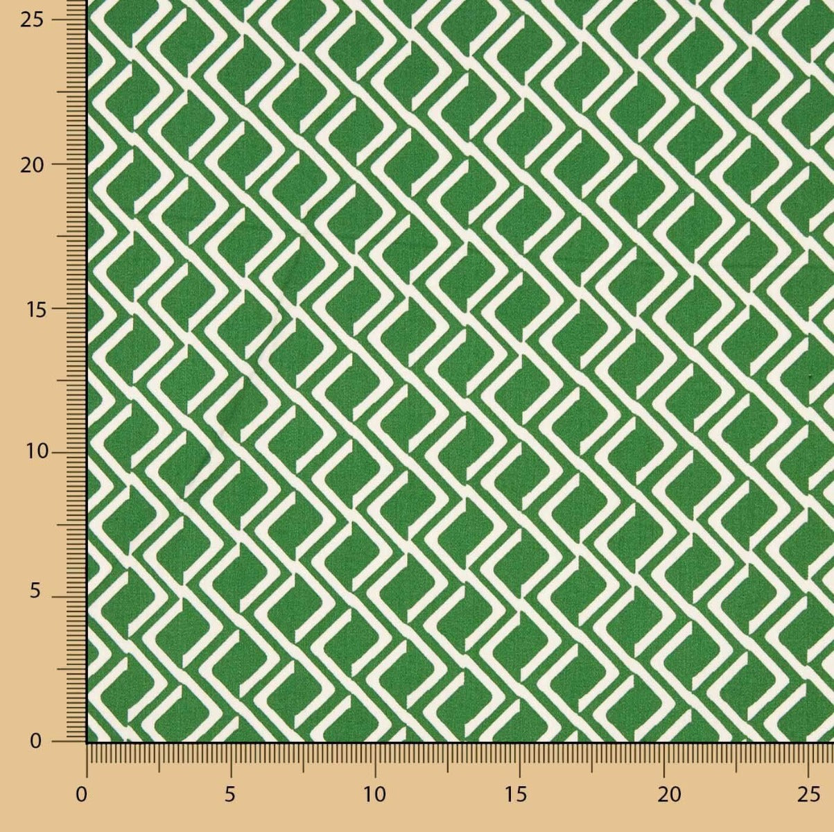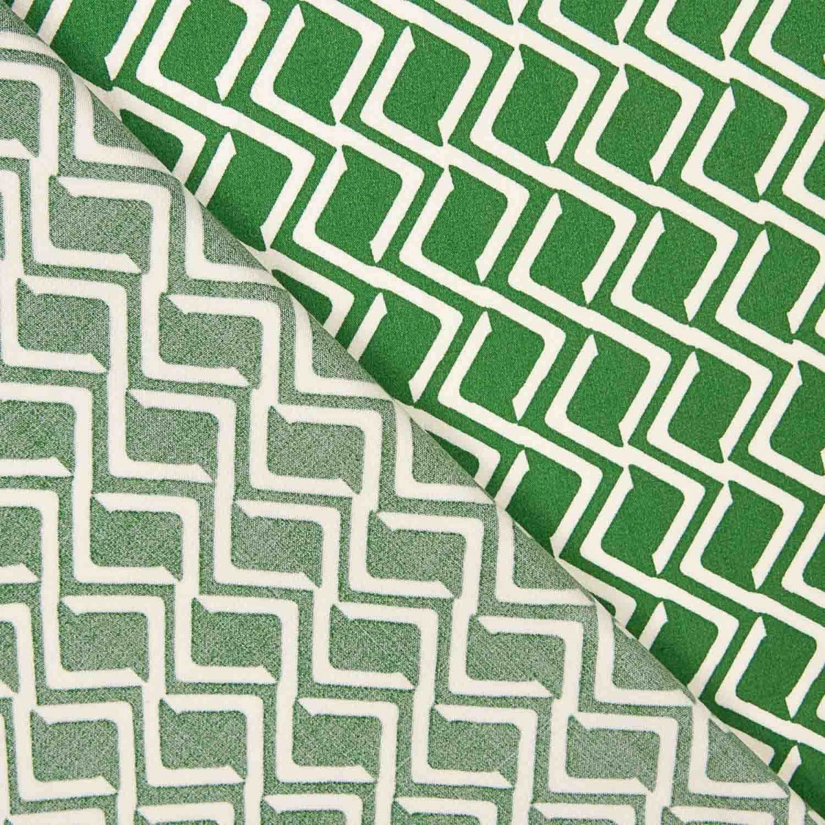 Tela de viscosa estampada geométrico verde. Viscosa con efecto de acabado de lino es la combinación perfecta de elegancia y confort.